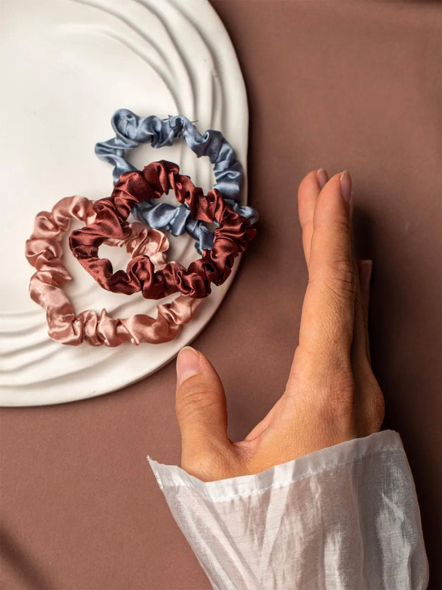 Scoprite un set di scrunchies in raso pensato per valorizzare le vostre acconciature ogni giorno. Il loro materiale morbido e setoso rispetta la fibra capillare e dona una luminosità delicata ai capelli.