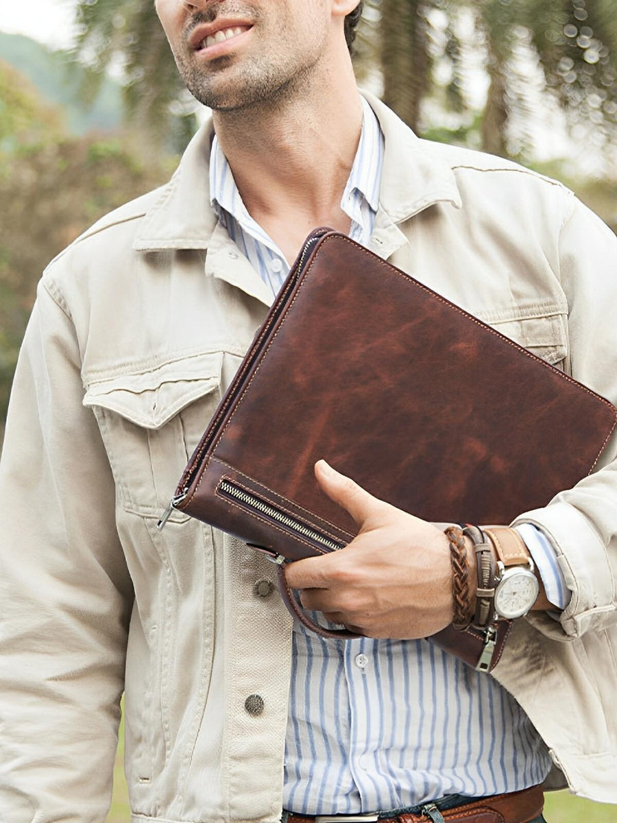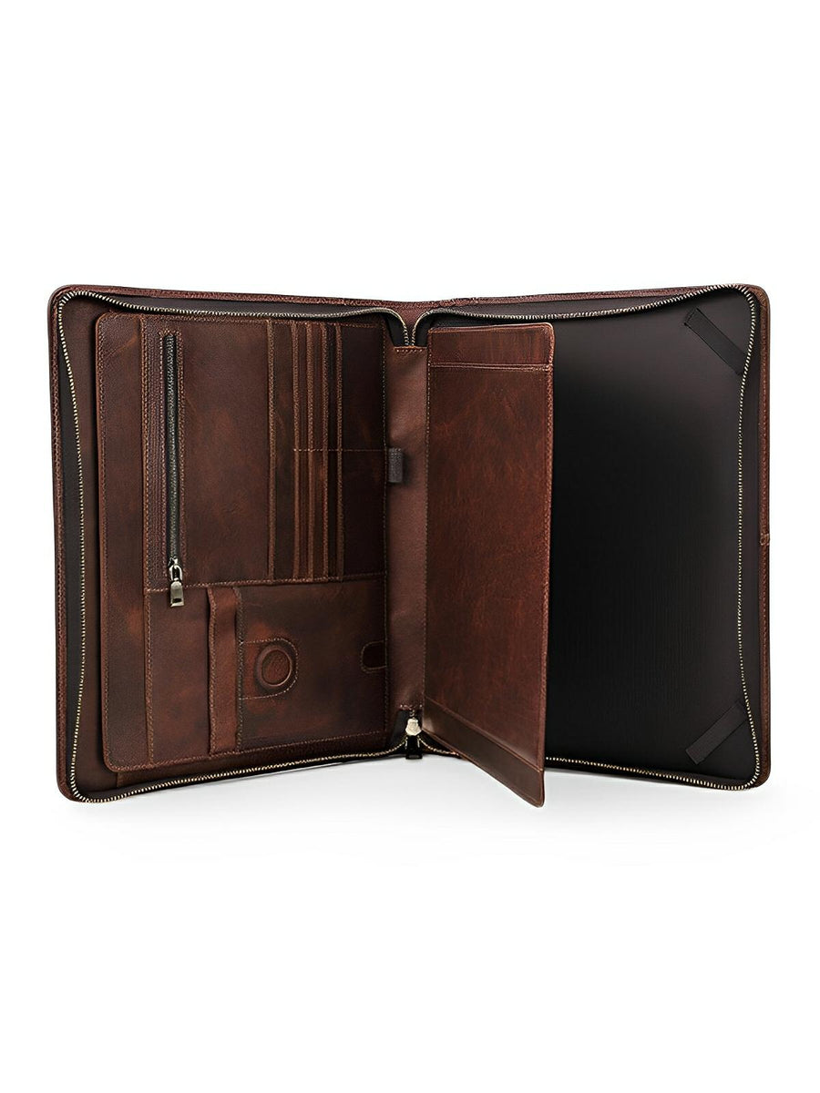 Custodia in pelle marrone per computer portatile, tablet e documenti, portacarte integrato, formato A4, modello Pamphil