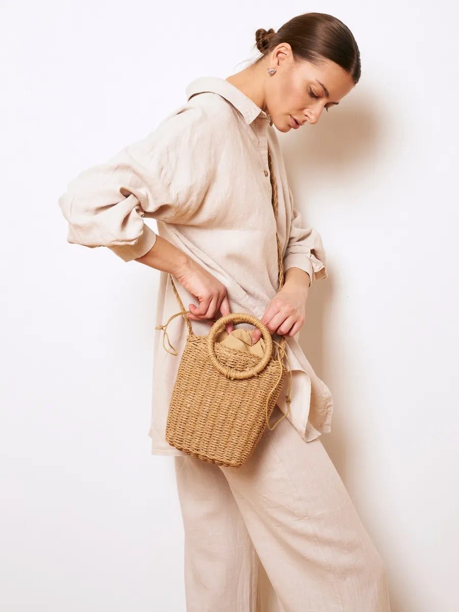 Borsa da spiaggia intrecciata, manico rotondo, tracolla lunga, fodera in cotone, formato compatto, mini tote bag, modello Paula