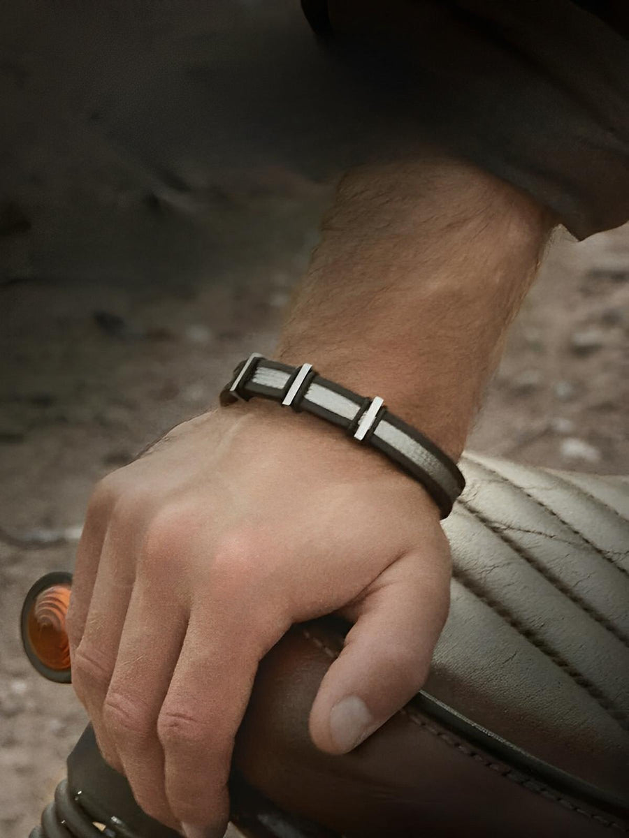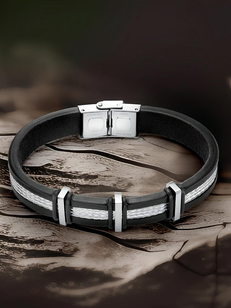 Affermate il vostro stile con questo bracciale da uomo in pelle e acciaio inox, progettato per unire carattere e raffinatezza. Il suo design strutturato combina una striscia di vera pelle a dettagli in acciaio inox, offrendo un’estetica al tempo stesso robusta e sofisticata.