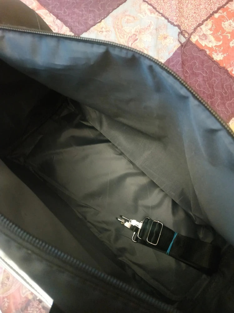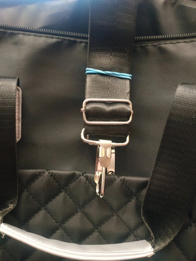 La sua tracolla regolabile permette di adattarla al trasporto a spalla o a tracolla, mentre i due manici robusti offrono una presa confortevole a mano. Sul retro, una discreta fascia consente di agganciarla facilmente al manico di una valigia per i vostri viaggi in treno o in aereo.