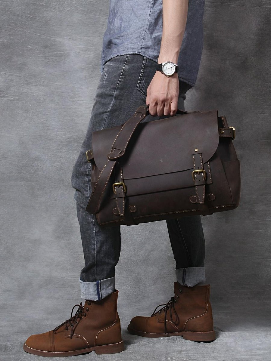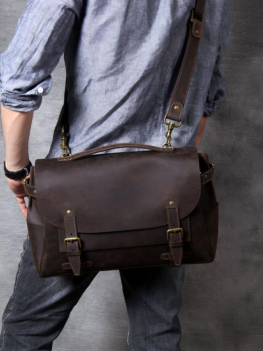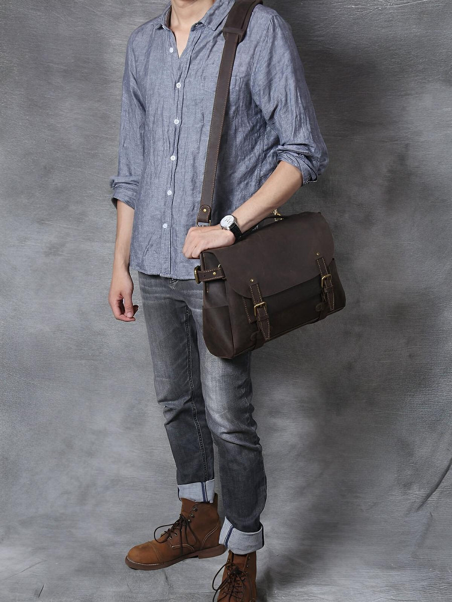 Scoprite questa borsa a tracolla in vera pelle, pensata per l’uomo moderno alla ricerca di praticità e stile. Realizzata in pelle pieno fiore, questa borsa unisce robustezza e raffinatezza grazie al suo design vintage senza tempo. Grazie alla sua grande capacità, può facilmente contenere i vostri documenti, un computer portatile da 15,6 pollici e molto altro ancora.