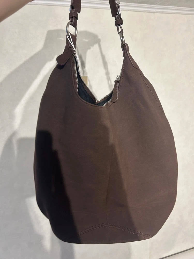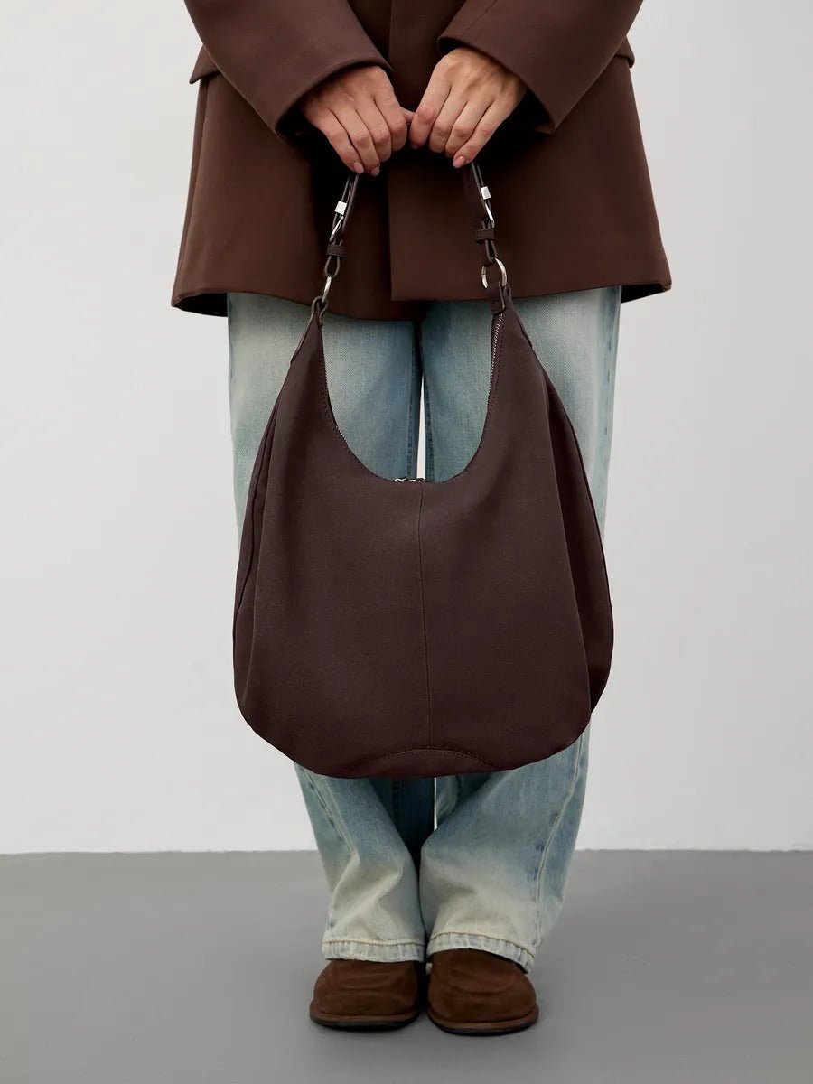 Trasformate la vostra quotidianità con questa borsa hobo di grande formato dal design minimalista e di tendenza. Realizzata in un tessuto scamosciato color cioccolato morbido al tatto, unisce stile casual e praticità senza compromessi.