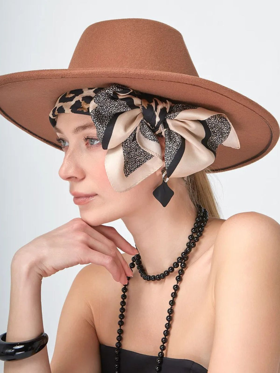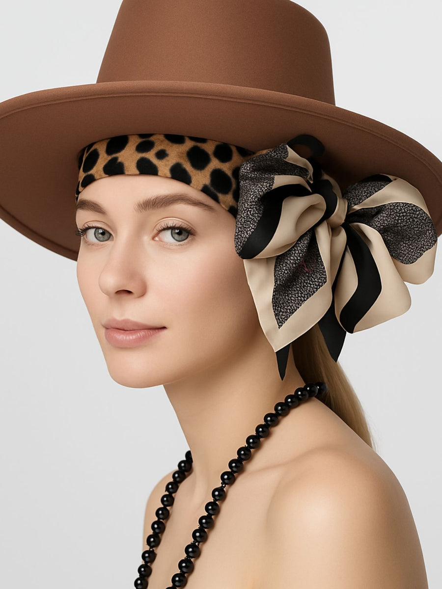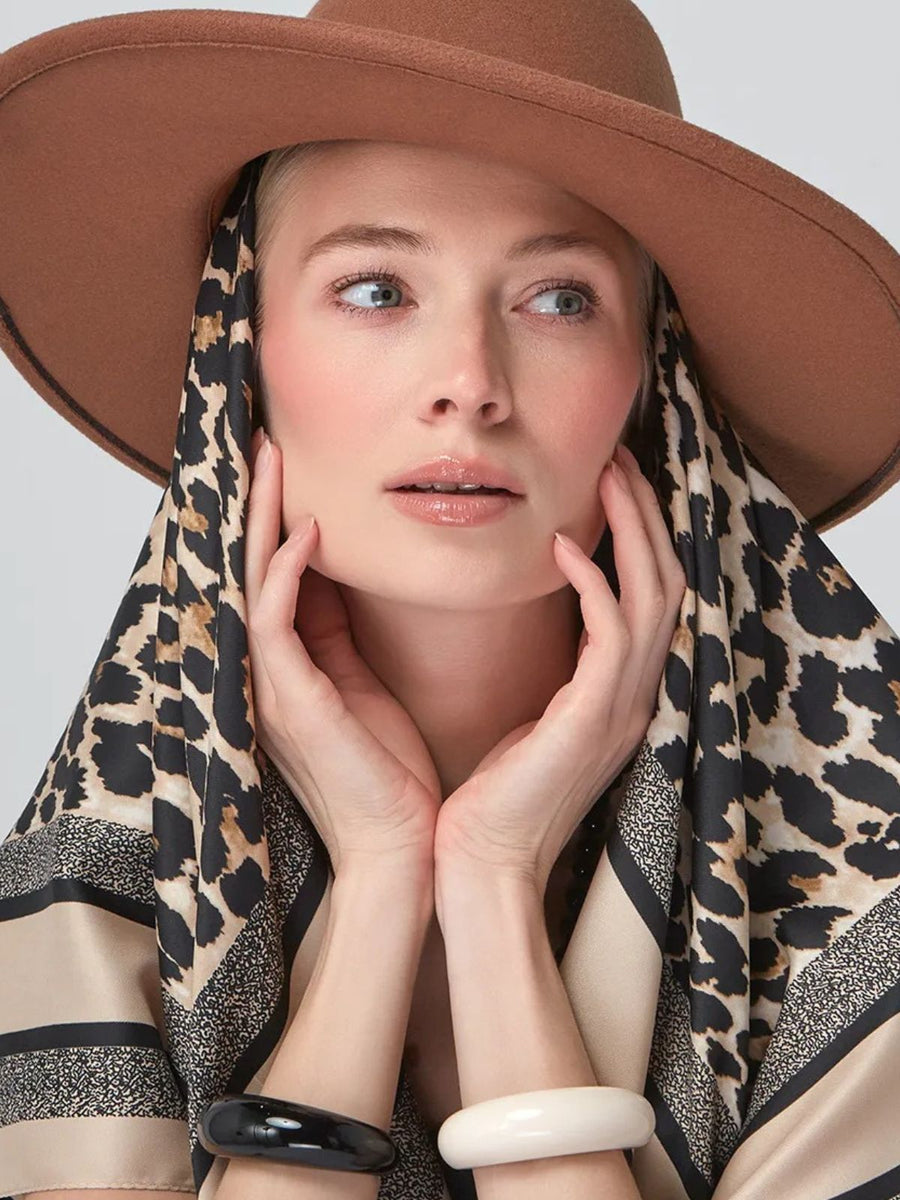 Il suo motivo leopardato beige e nero incorniciato da sottili bordature geometriche crea un raffinato contrasto visivo. Si indossa sia annodato intorno al collo, come accessorio per capelli in stile fascia o turbante, sia come stola leggera appoggiata sulle spalle.