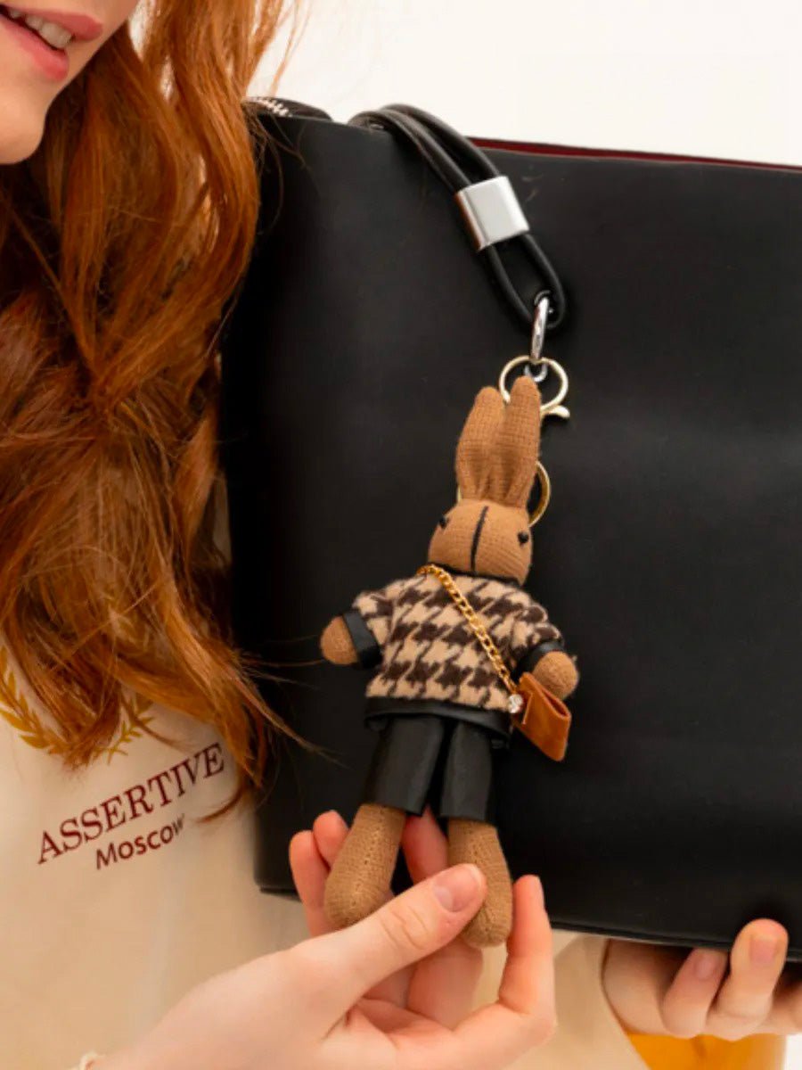 Questo portachiavi con coniglio reinventa il bijoux da borsa con un tocco di umorismo e stile. Vestito con un maglione a motivo pied-de-poule e shorts in similpelle, questo piccolo compagno in maglia sfoggia un look estremamente alla moda. La catena dorata sulla spalla che regge una borsetta in miniatura aggiunge una nota originale e irresistibile.