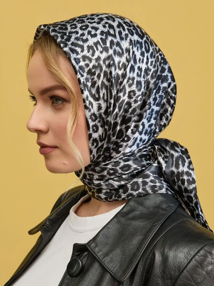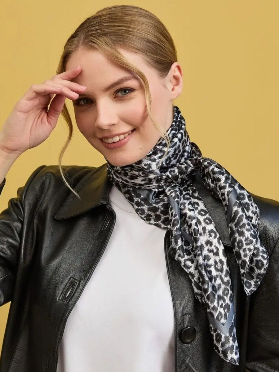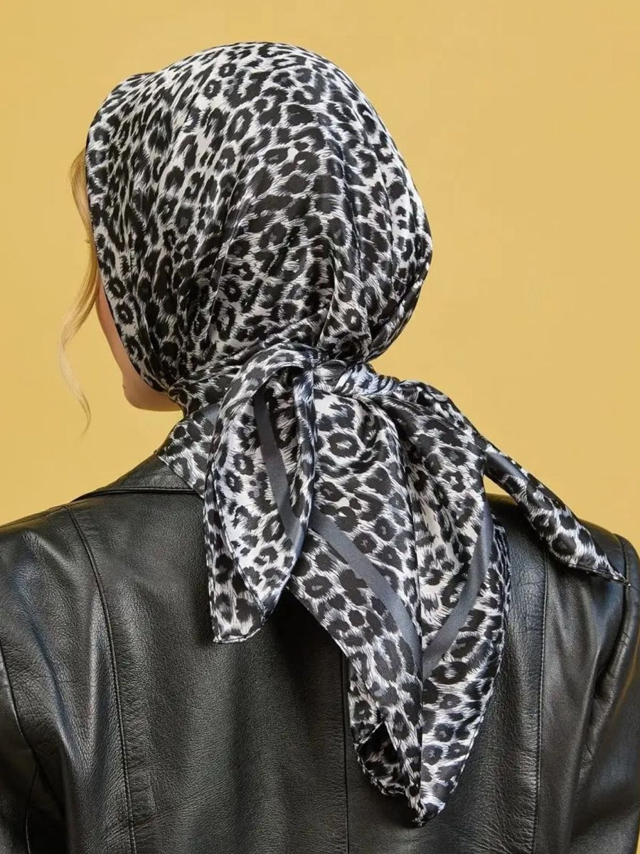 Foulard carré léopard, effet seta nero e bianco, accessorio per capelli stampa animalier, foulard in raso di poliestere, carré moda donna, modello Rebekah
