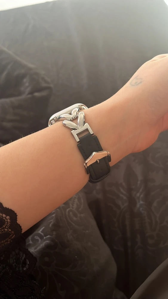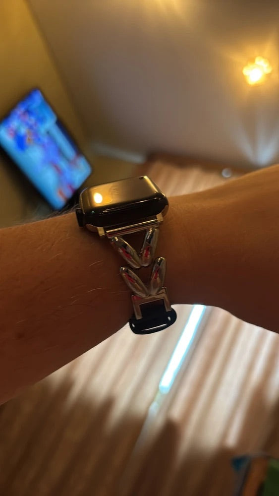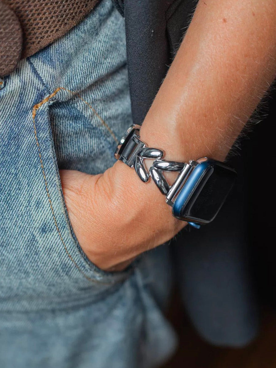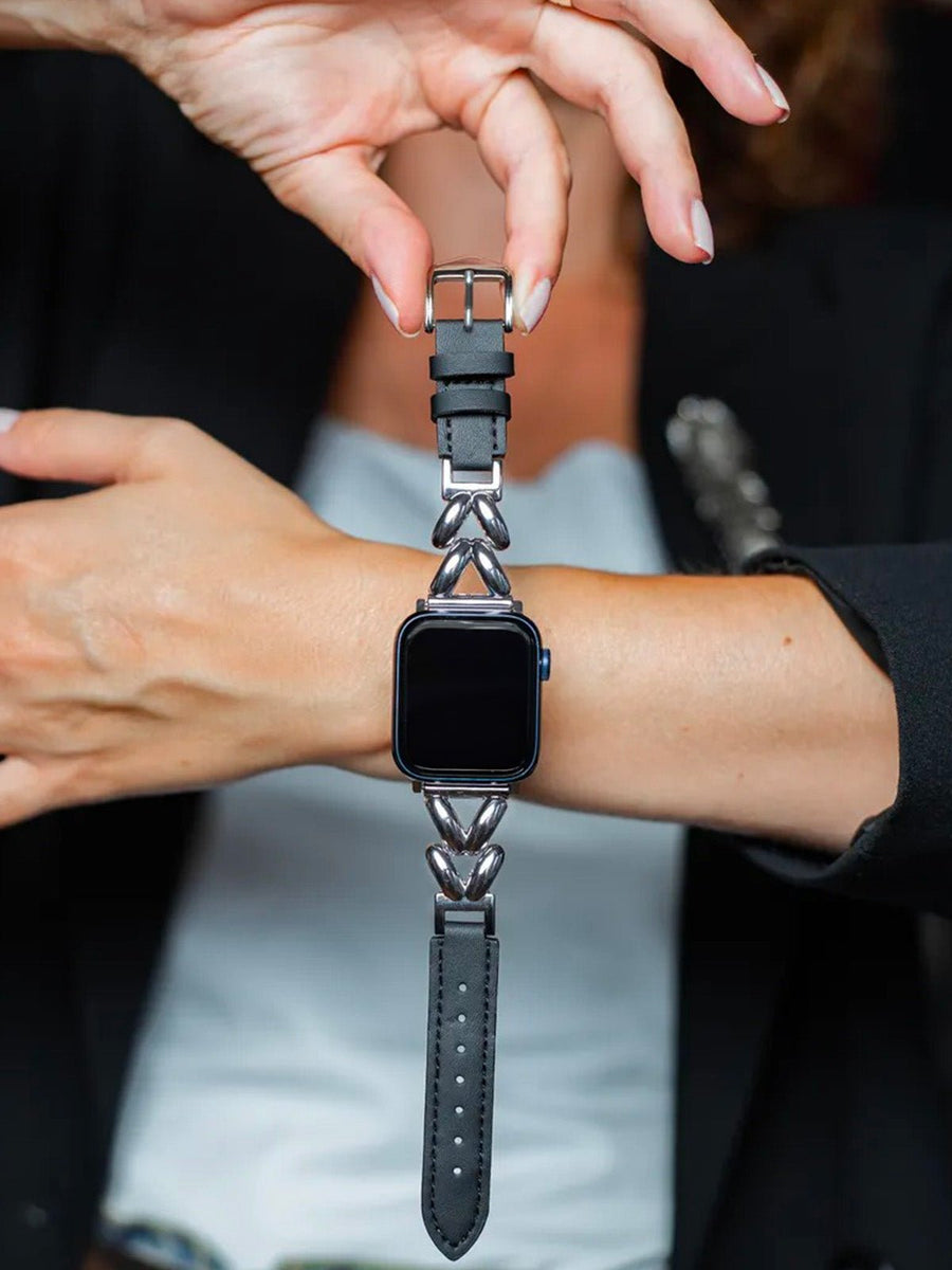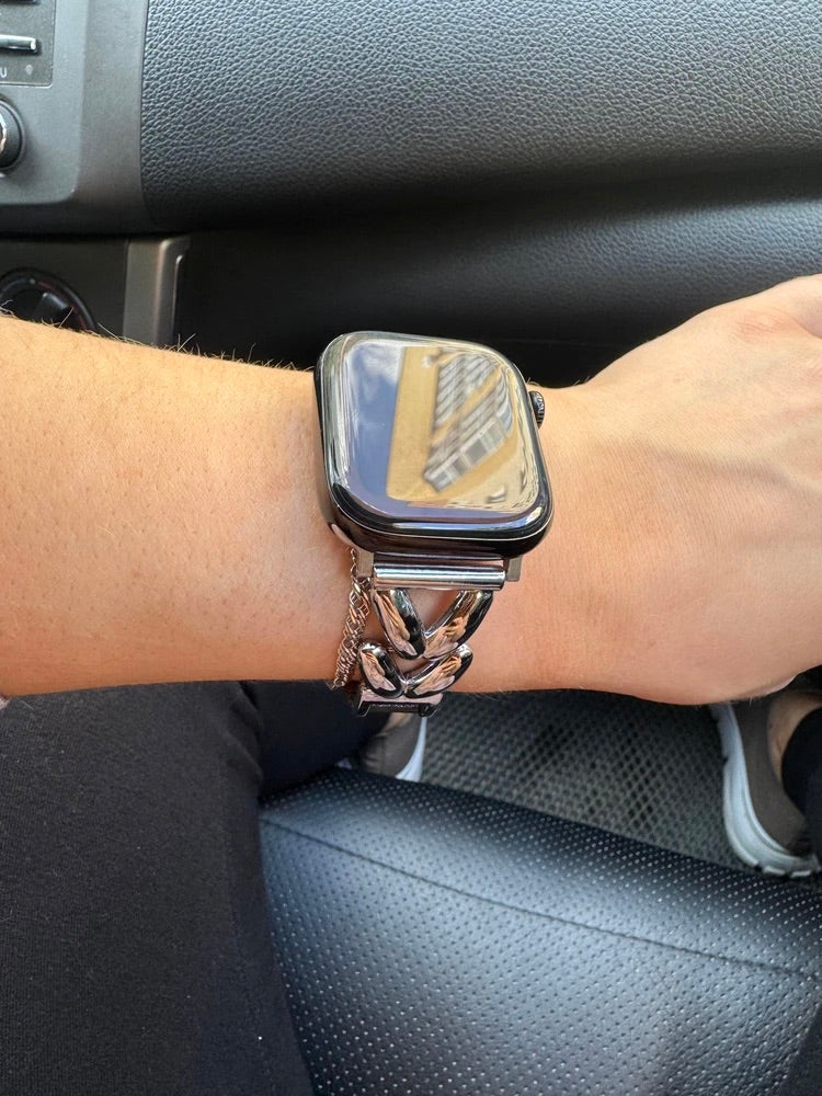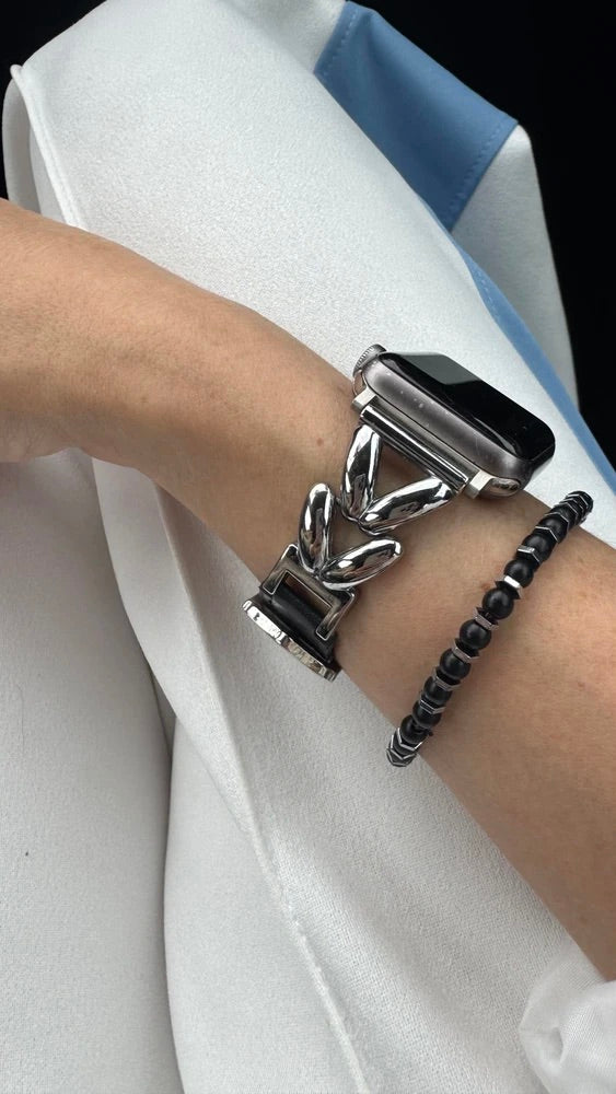 Offrite un nuovo volto al vostro Apple Watch con questo cinturino in vera pelle impreziosito da maglie metalliche argentate dal design a foglia.