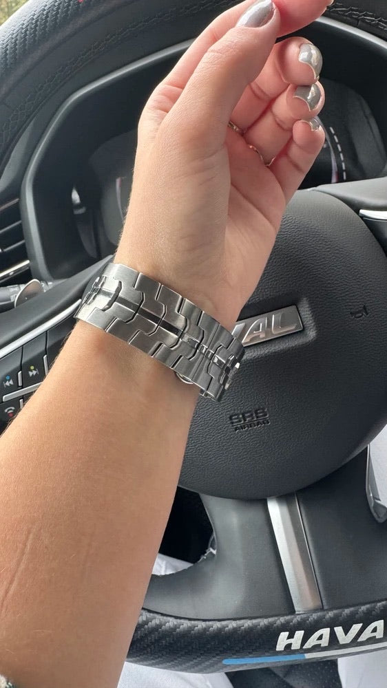 Grazie al suo trattamento anti-graffio e anti-ossidazione, questo cinturino mantiene la sua brillantezza e la sua finitura di alta qualità anche dopo un uso prolungato. La sua chiusura a farfalla di sicurezza assicura una chiusura affidabile e una rapida indossabilità.