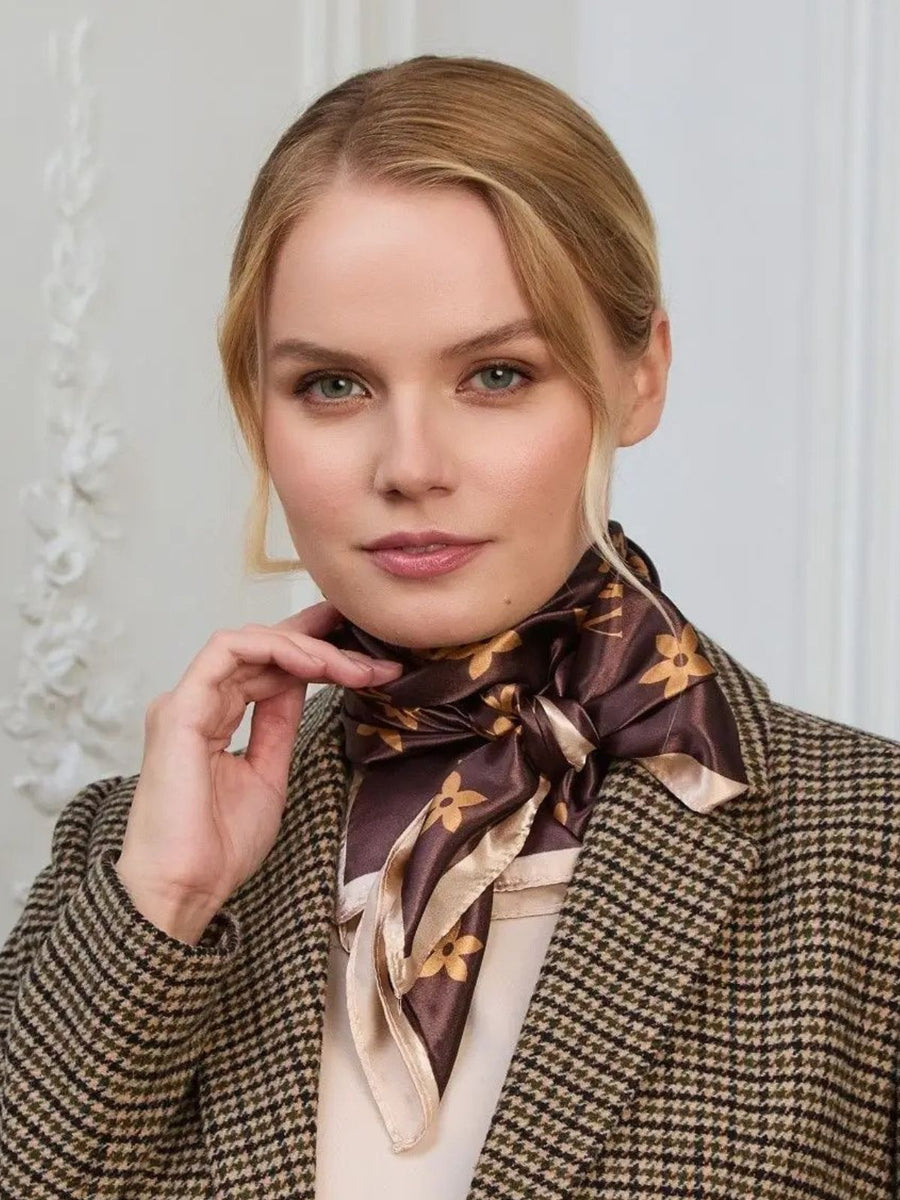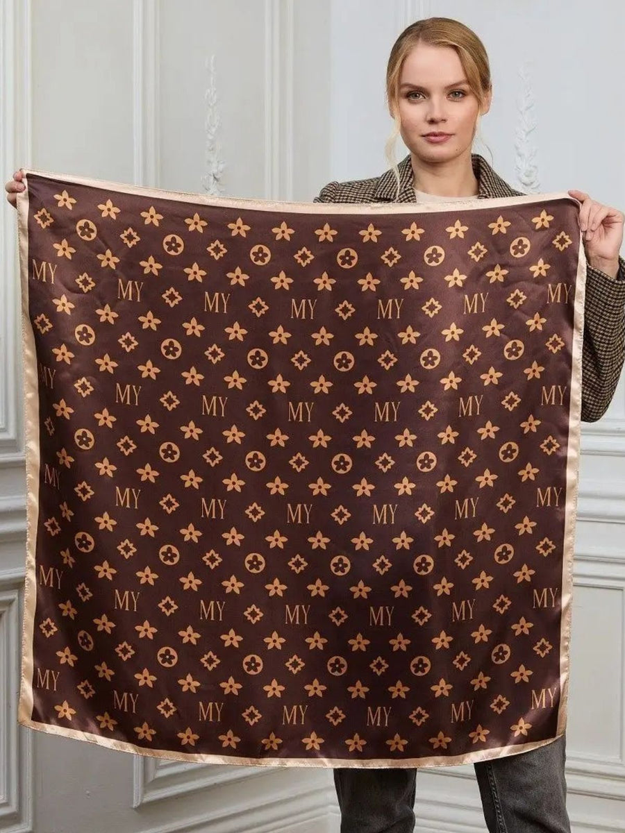 Foulard carré effetto satinato marrone dorato, stampa floreale e lettere MY, formato 90x90 cm, accessorio per capelli o collo, modello Rihanna