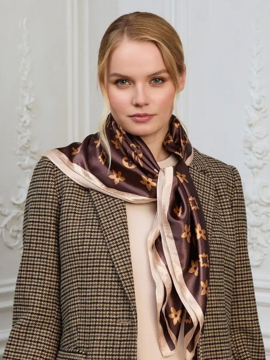 Questo foulard quadrato da 90 x 90 cm conquista per la sua caduta fluida e la texture setosa. Realizzato in poliestere effetto satinato, imita con maestria l’aspetto della seta, donando una luce sottile e raffinata a ogni movimento. Il fondo marrone intenso contrasta con un motivo stampato dorato: fiori stilizzati e lettere «MY» disposte a mosaico per un tocco grafico deciso.