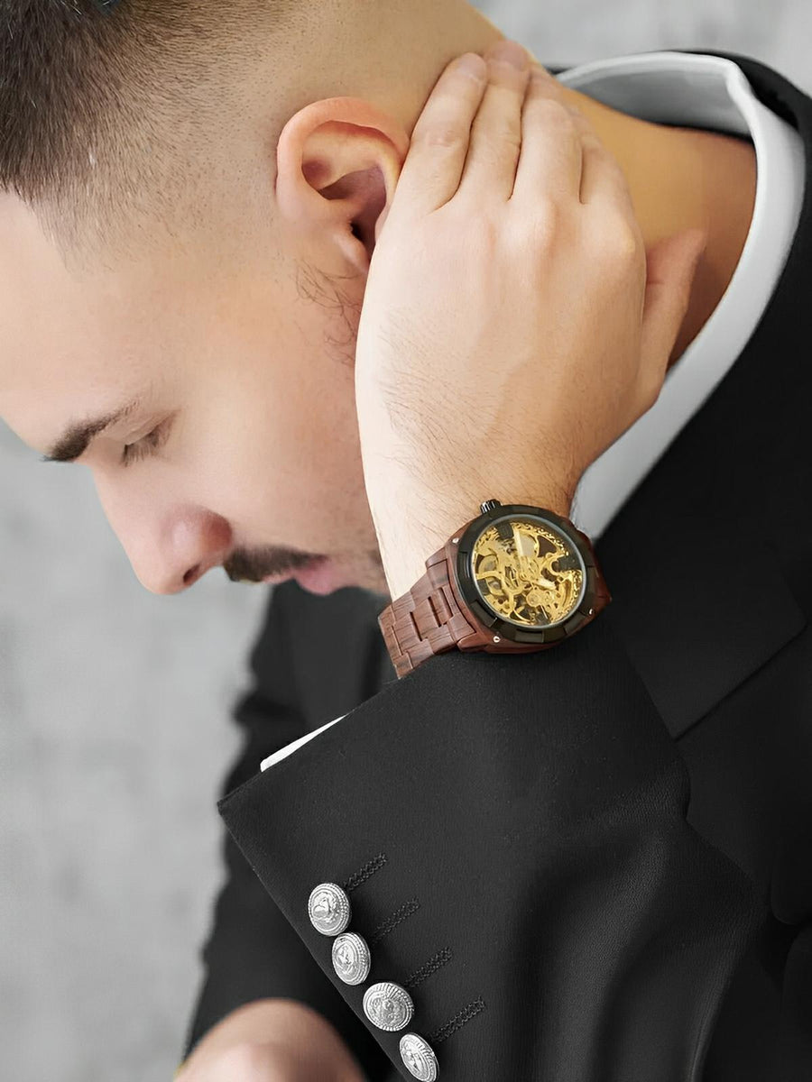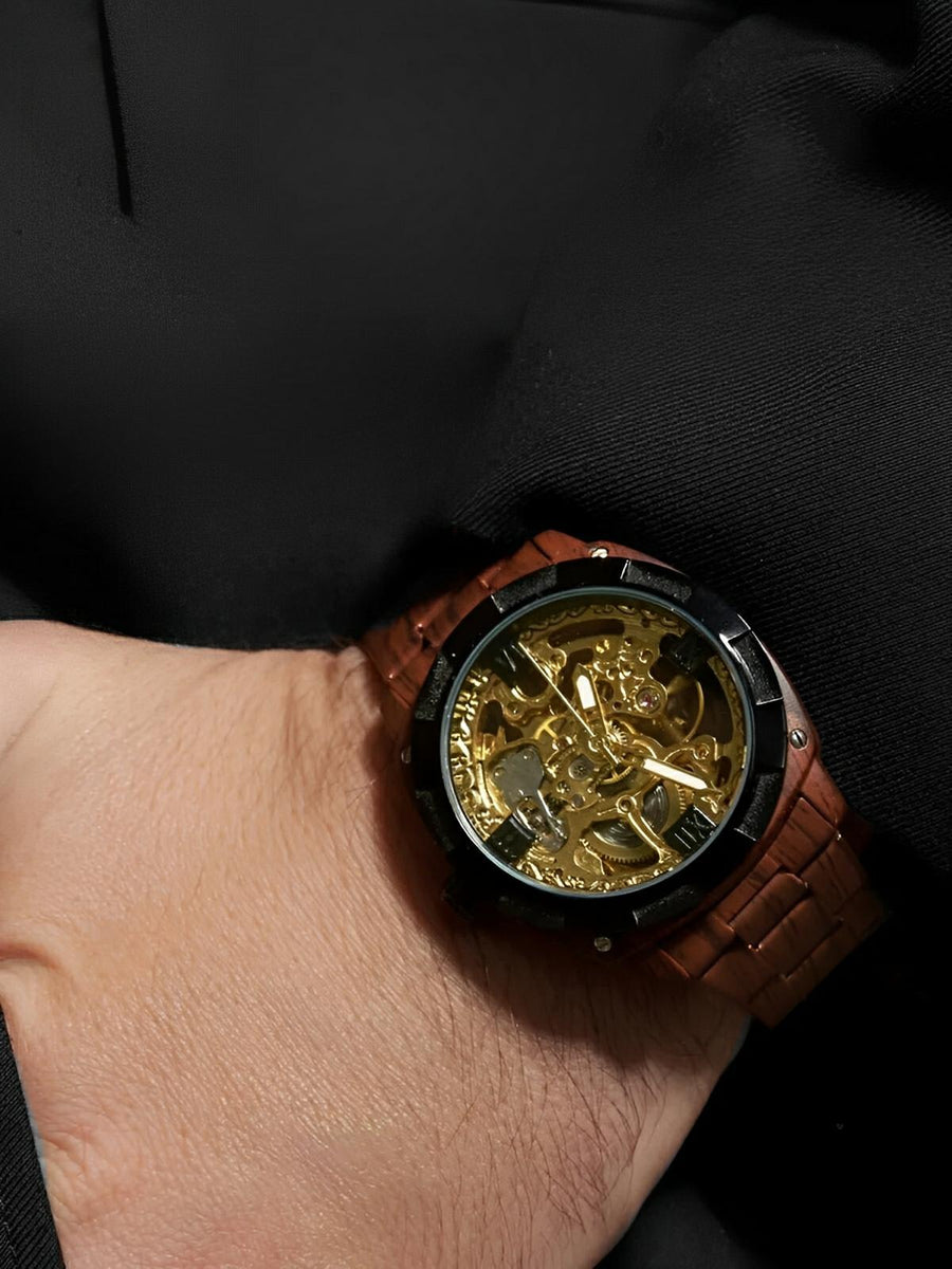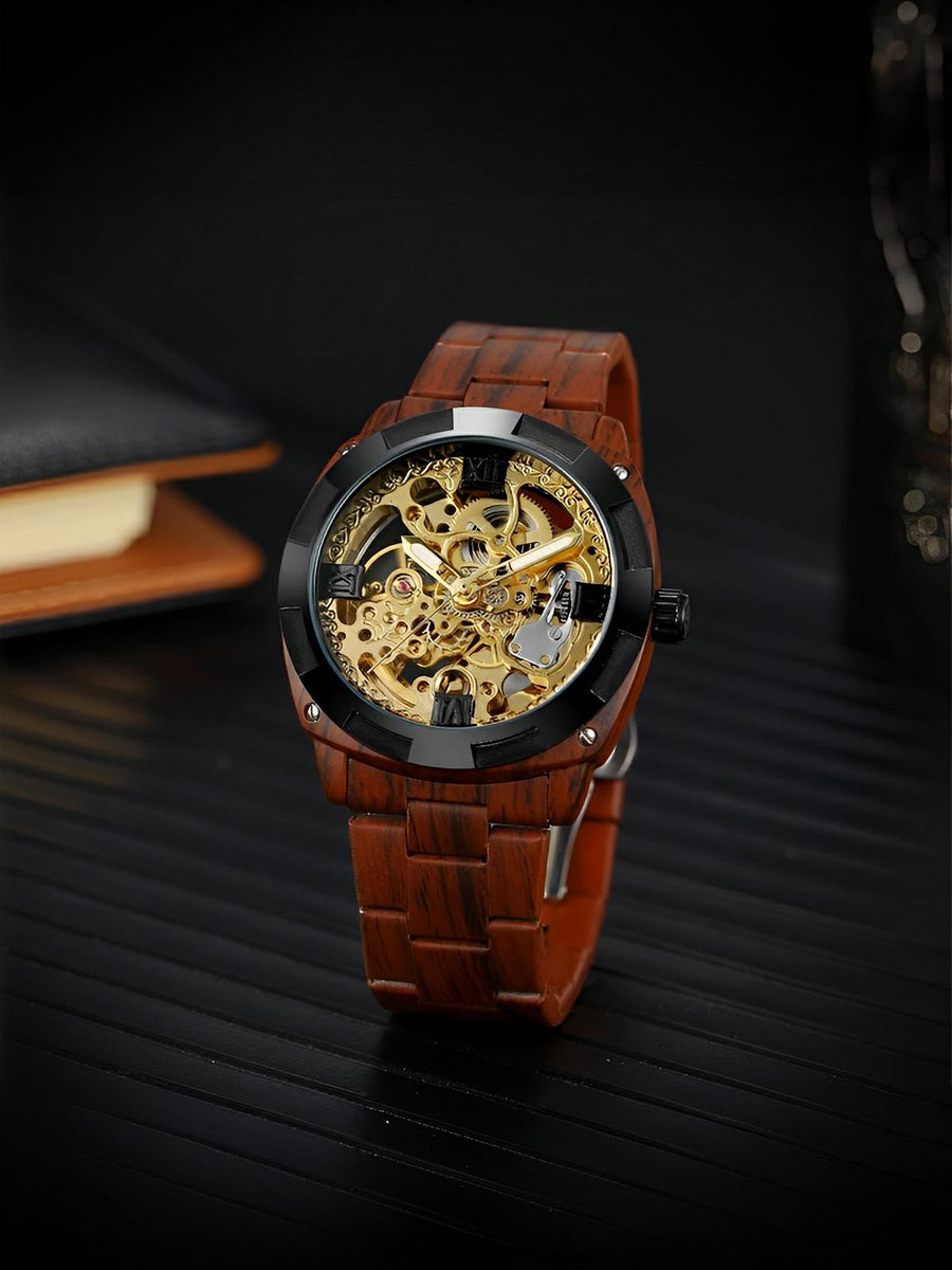 Orologio automatico scheletrato, cinturino con finitura in legno, movimento meccanico, modello Robin