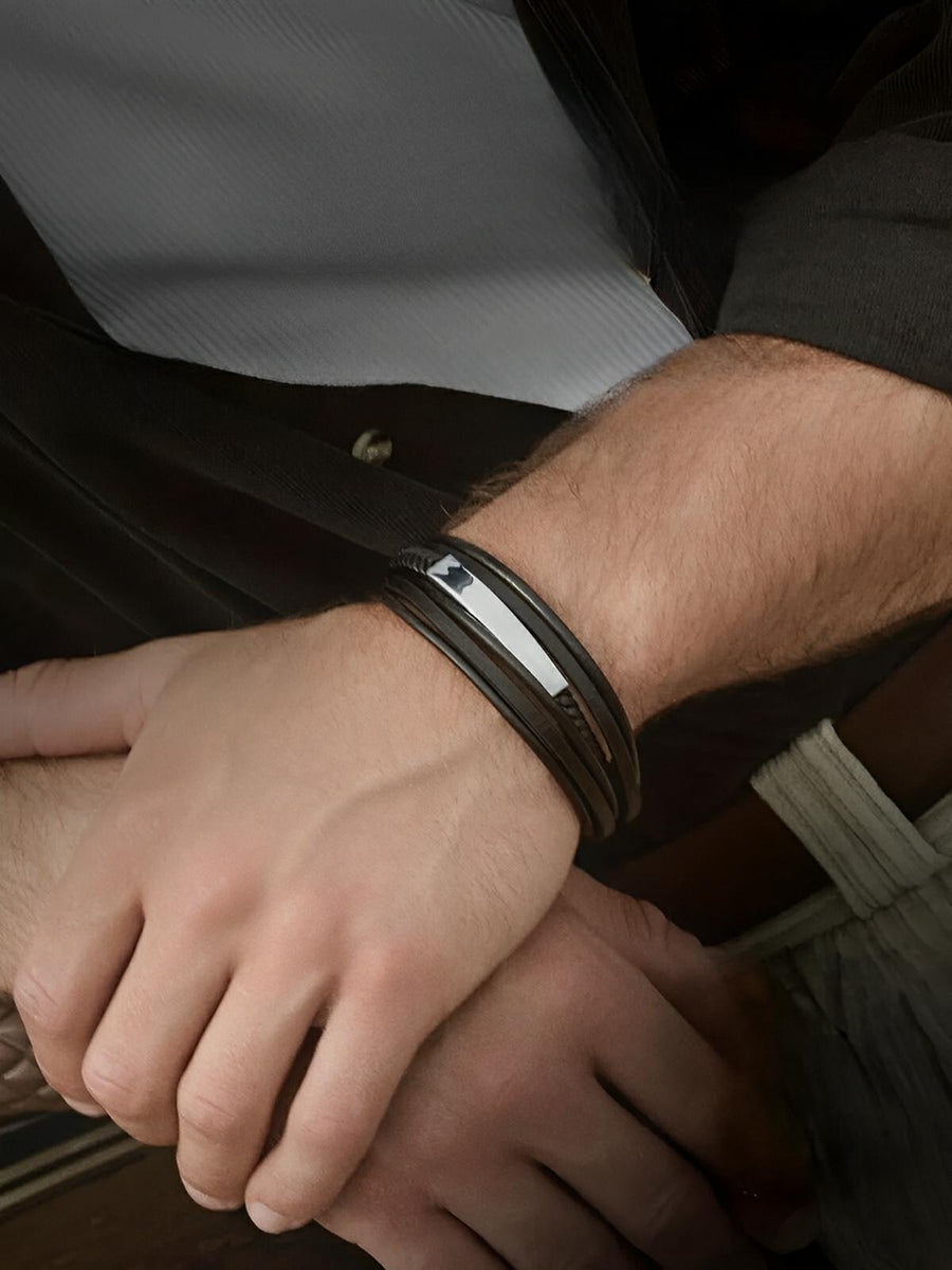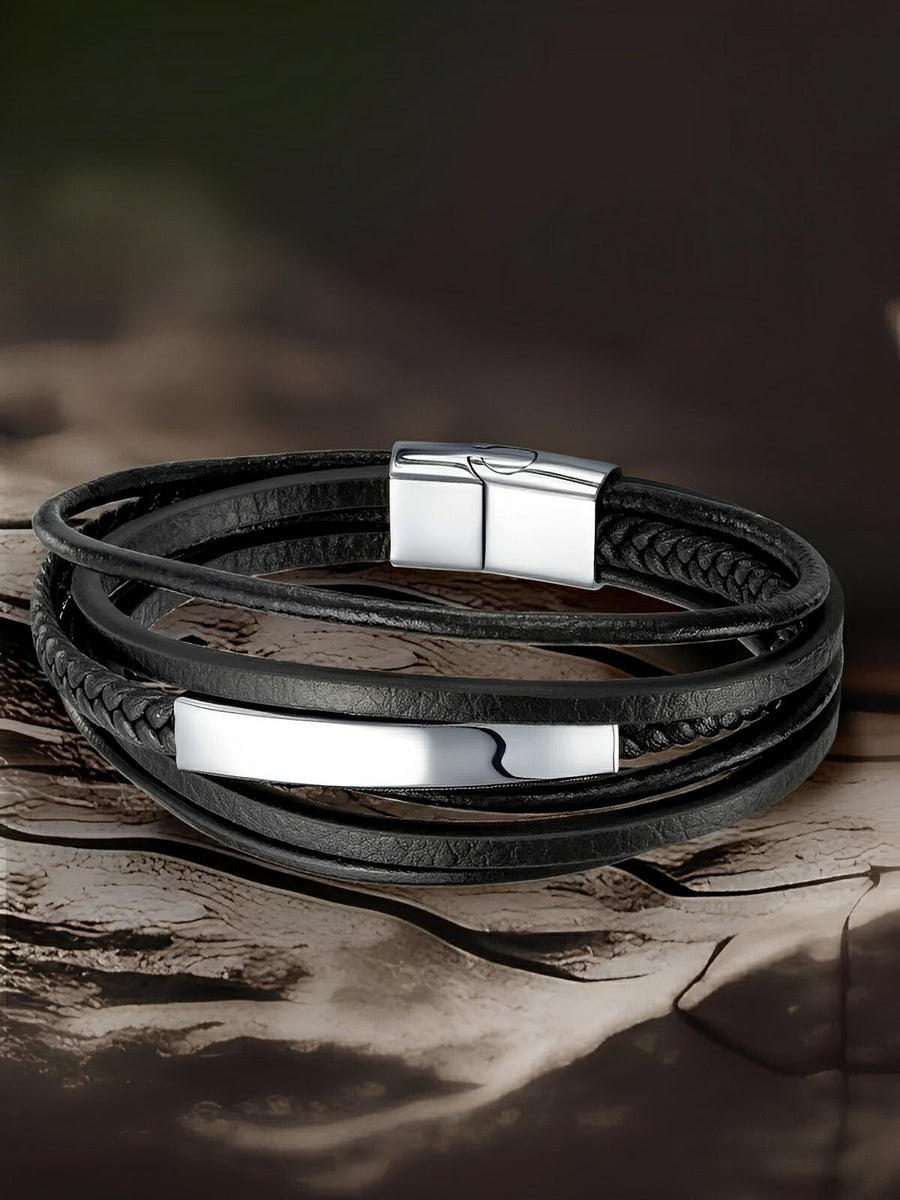 Bracciale multi-fili da uomo in pelle nera e acciaio inossidabile, chiusura magnetica, modello Roney