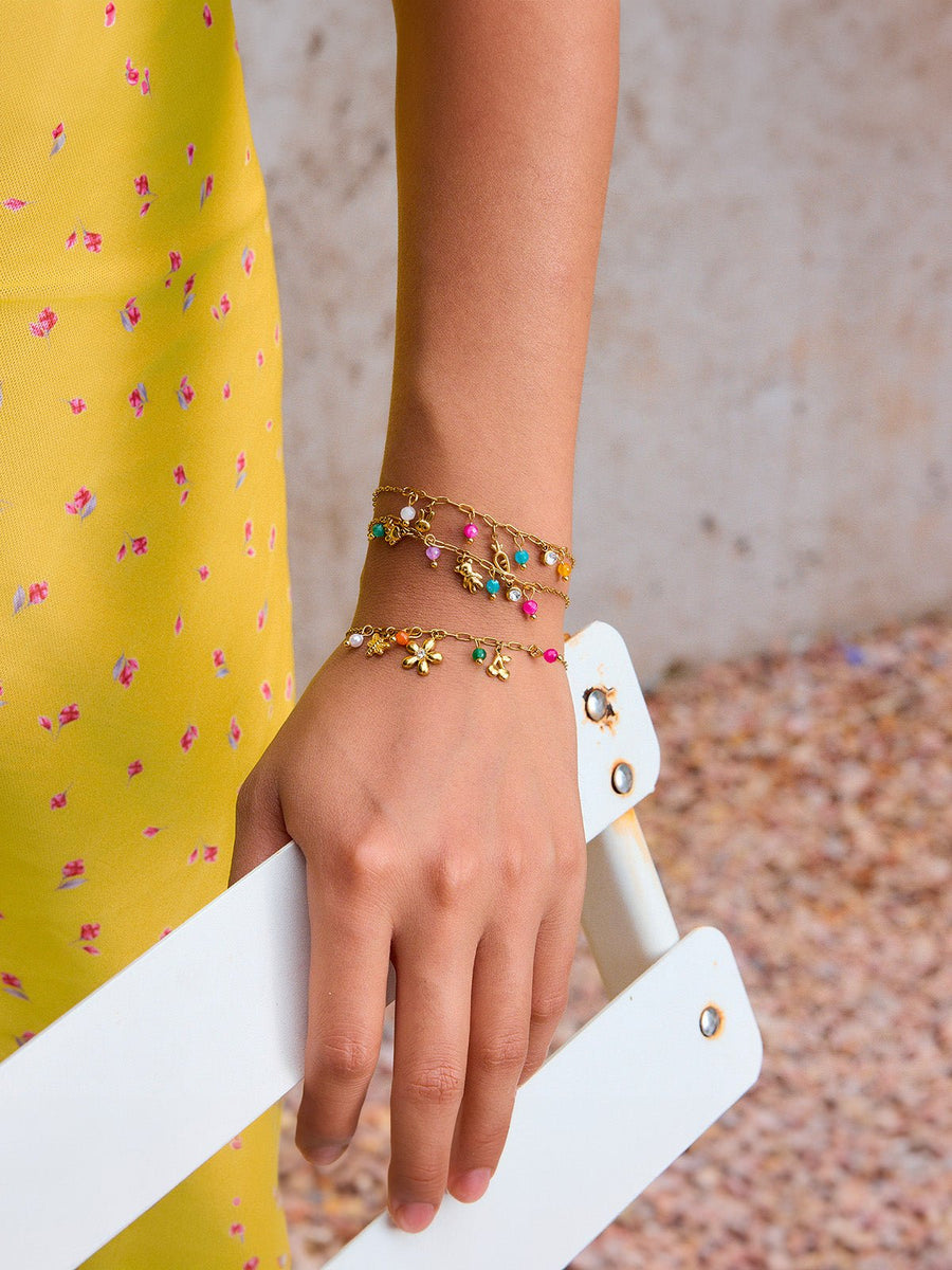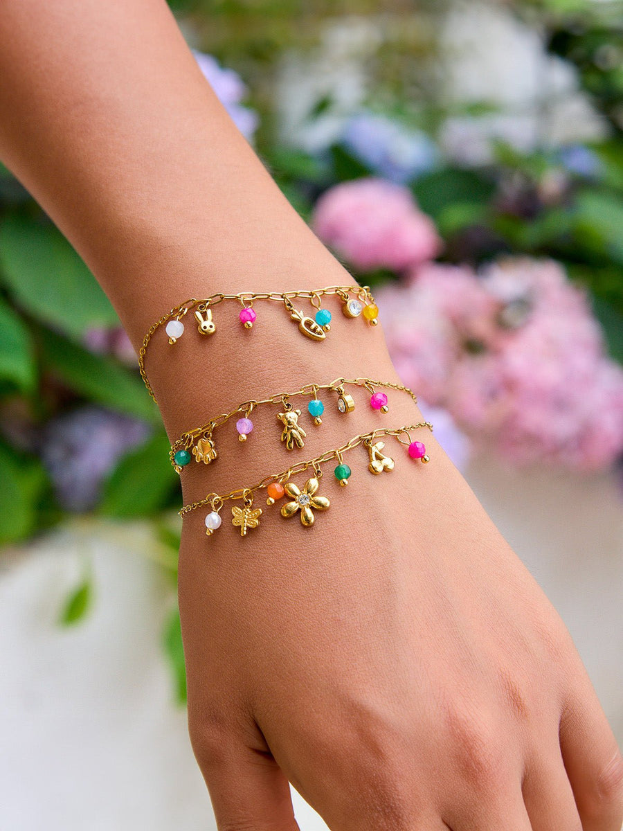 Questo bracciale fantasia dorato cattura lo spirito gioioso e leggero dell’estate con le sue charm ricchi di fascino. Montato su una sottile catena regolabile, è impreziosito da perle colorate e ciondoli in miniatura — fiori, coniglio, carota, farfalla o ciliegia — per un tocco vivace e rinfrescante.