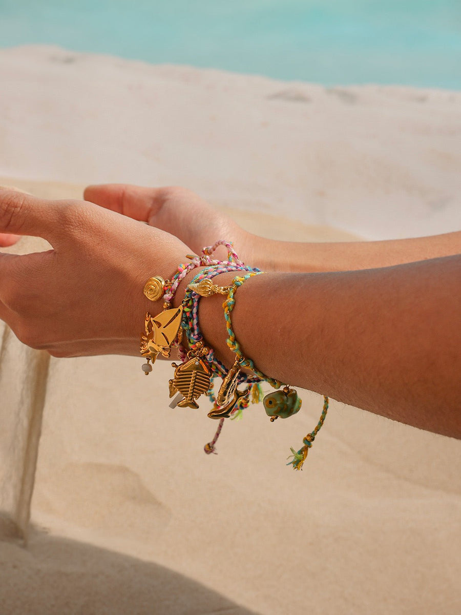 Aggiungete un tocco di fantasia marina al vostro polso con questo bracciale con cordino colorato, impreziosito da ciondoli dorati in acciaio inox. Che scegliate un pesce, una conchiglia, un granchio o una stella marina, ogni dettaglio richiama l’universo delle vacanze in riva al mare.