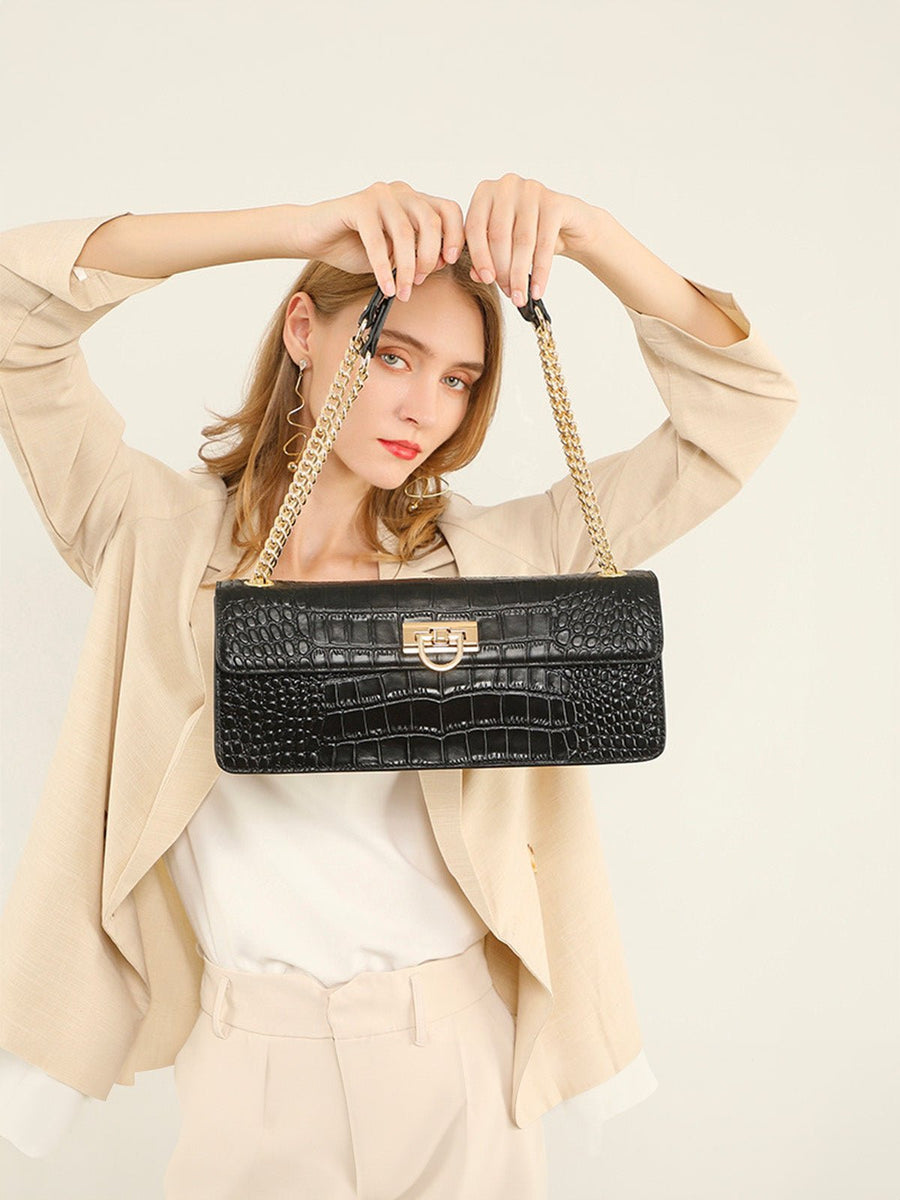 Borsa a tracolla da donna, effetto coccodrillo, catena dorata, formato rettangolare, stile chic, borsa con patta, modello Savine