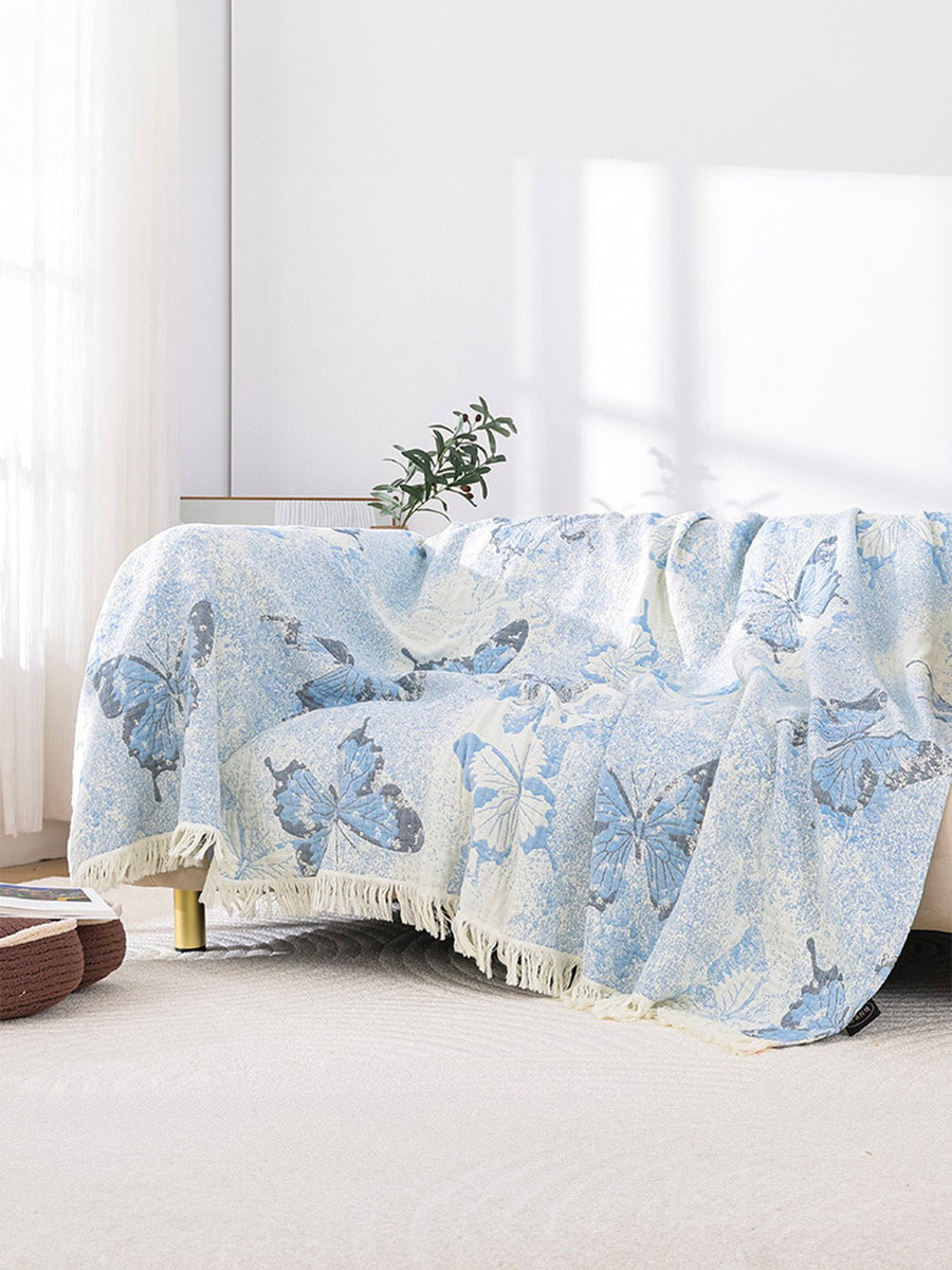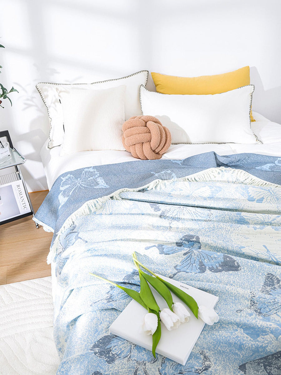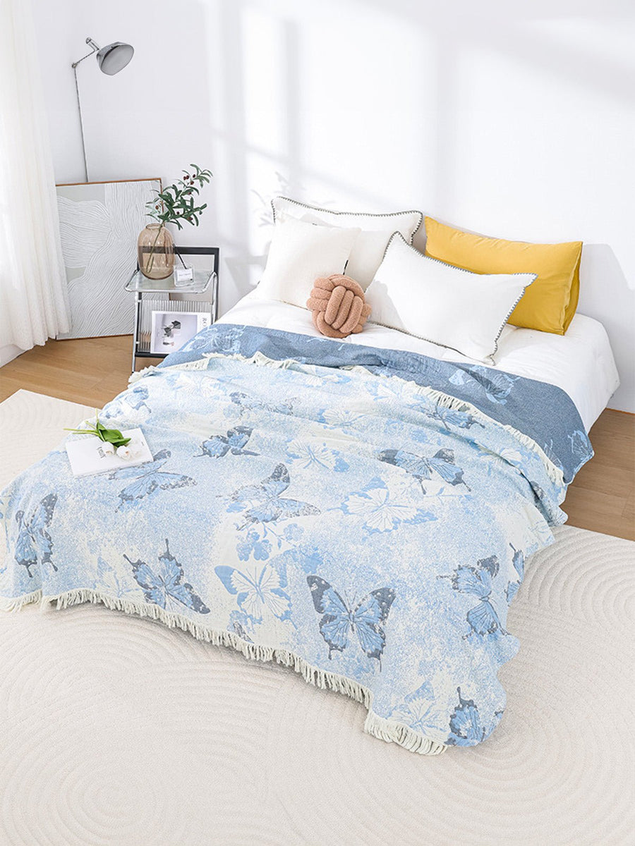 Immergetevi in una sensazione di freschezza e morbidezza con questo plaid in puro cotone, decorato da un delicato motivo di farfalle blu. Le sue generose dimensioni di 200 x 230 cm permettono di utilizzarlo sia come copriletto che come coperta per i momenti di relax sul divano.