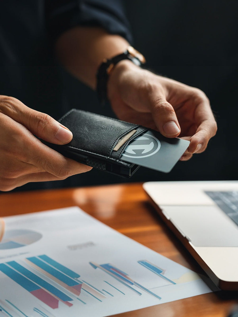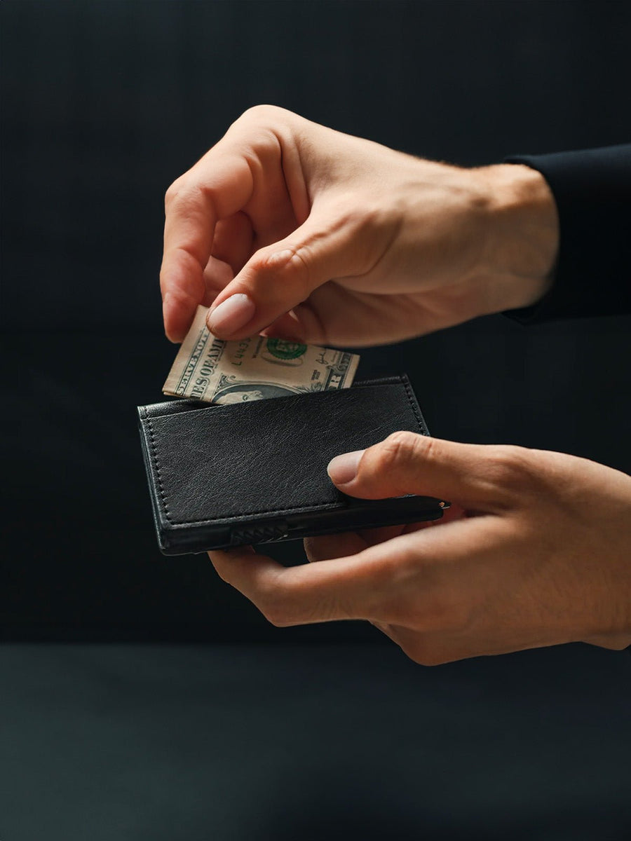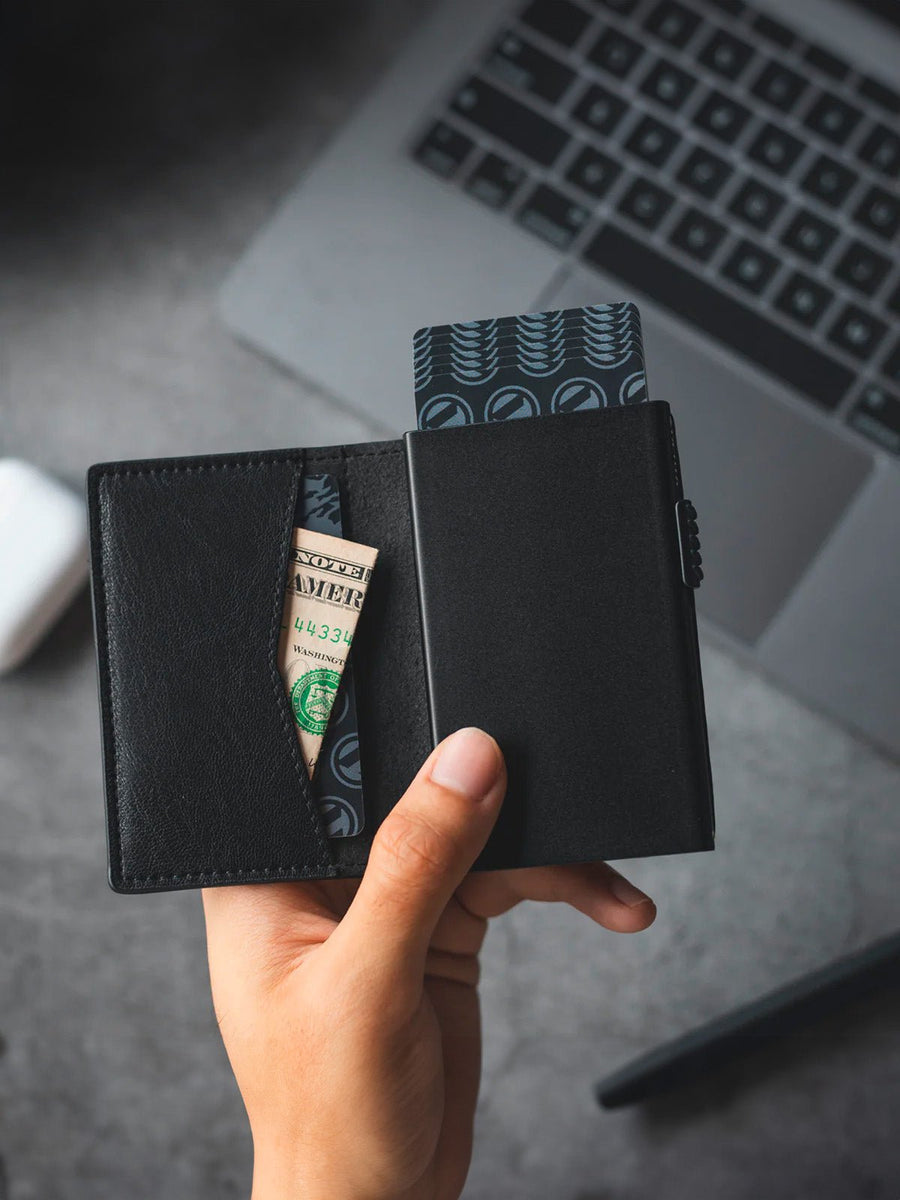 Il suo nucleo in alluminio robusto può contenere fino a 6 carte in totale sicurezza, mentre le 4 fessure in pelle permettono di aggiungere ulteriori carte e banconote piegate. Il tutto rimane perfettamente organizzato in un design sottile e discreto, adatto alle tasche di giacche o pantaloni.