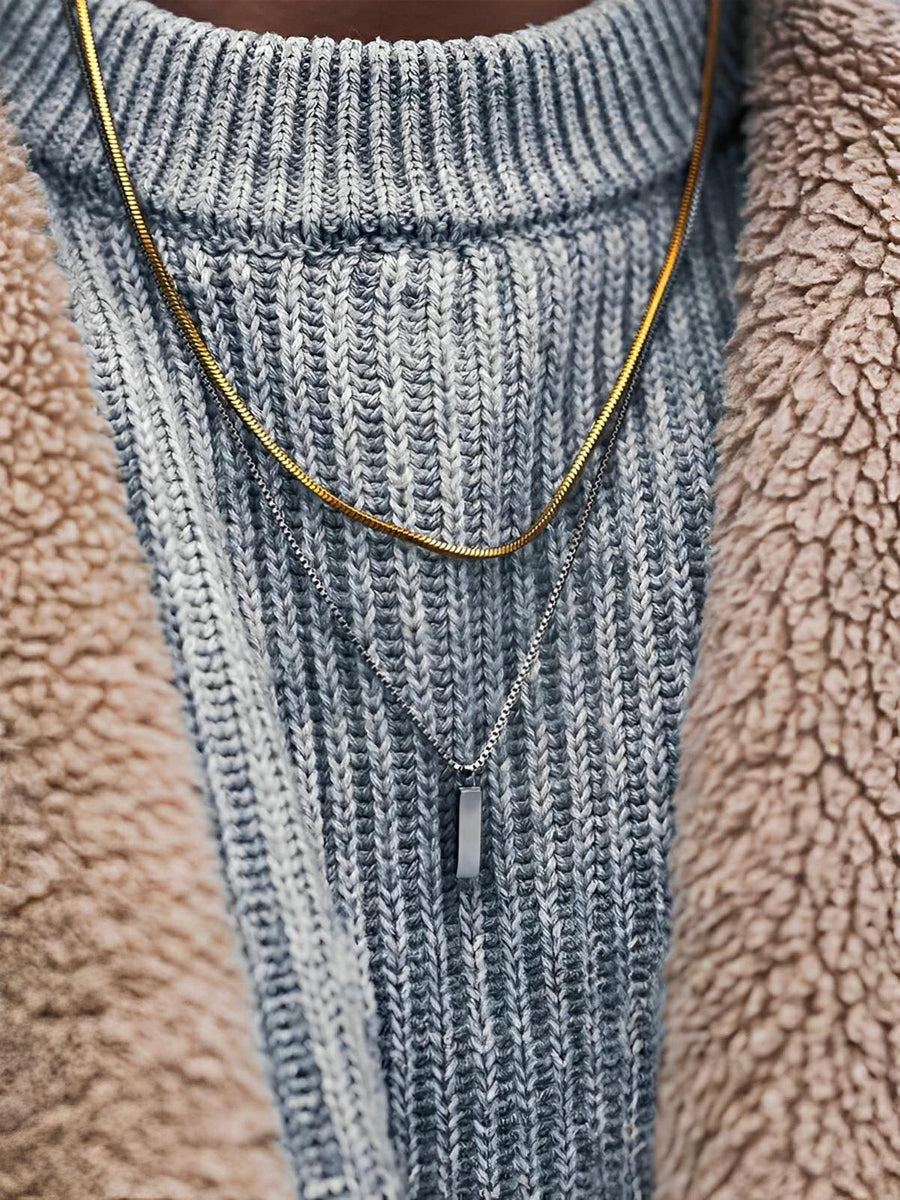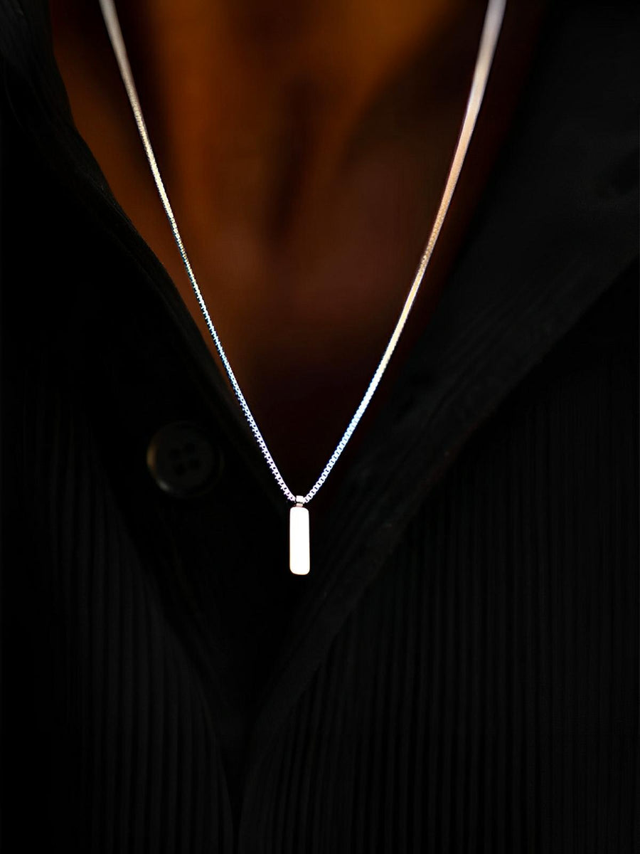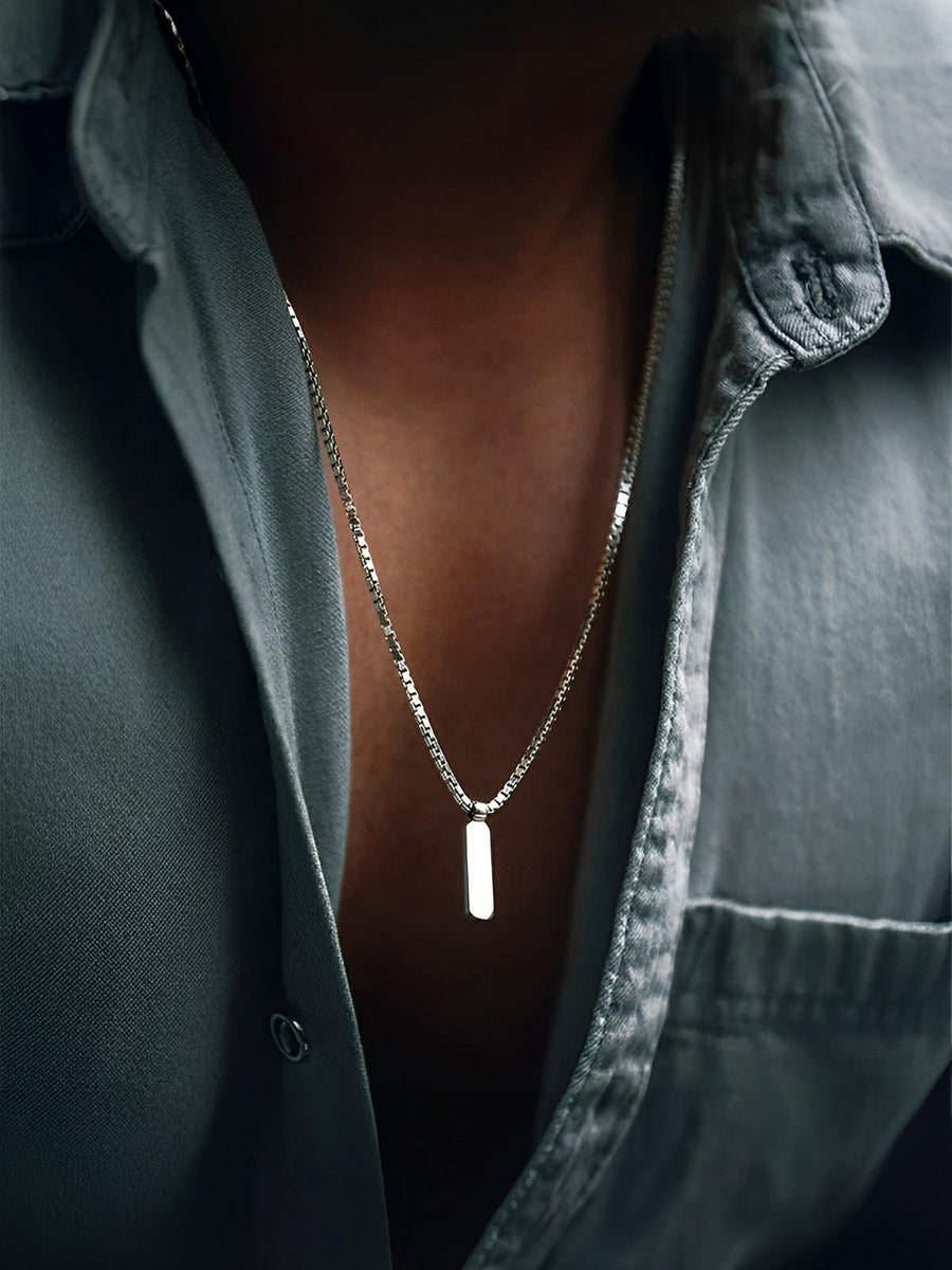 Questa collana maschile in acciaio inox unisce minimalismo e presenza con un pendente geometrico essenziale montato su una catena veneziana flessibile. Il suo design rettangolare lucidato riflette una luce soffusa, aggiungendo un tocco contemporaneo a qualsiasi outfit.