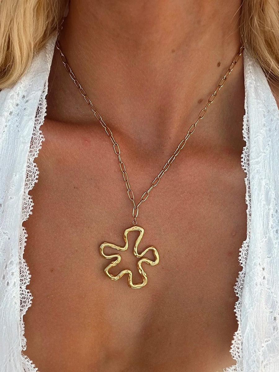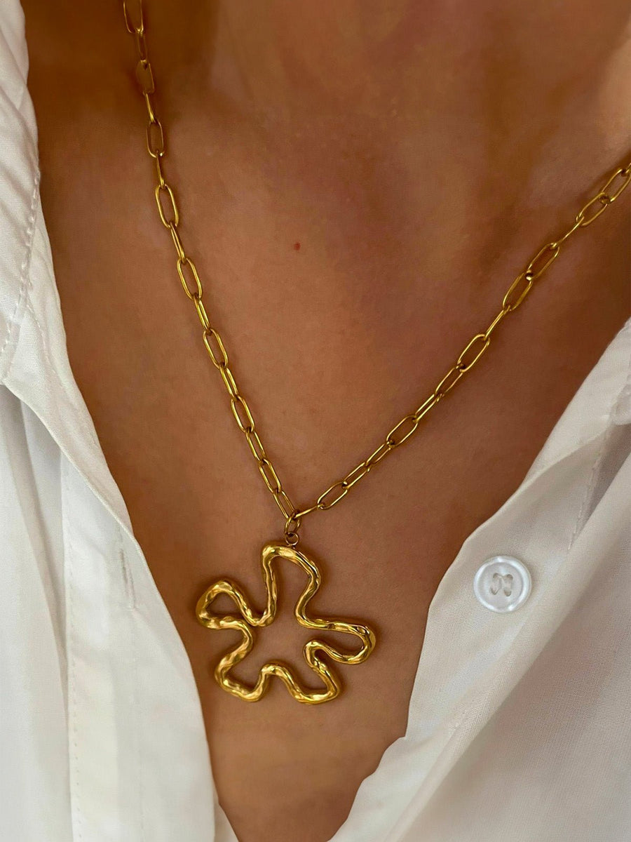 Esprimete il vostro stile con questa collana dorata dal design scultoreo, pensata per valorizzare un look moderno con un tocco di carattere. Il suo pendente a forma di fiore astratto, dalle linee fluide e organiche, cattura la luce da ogni angolazione.