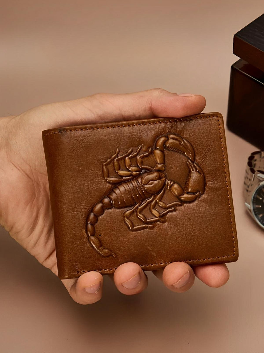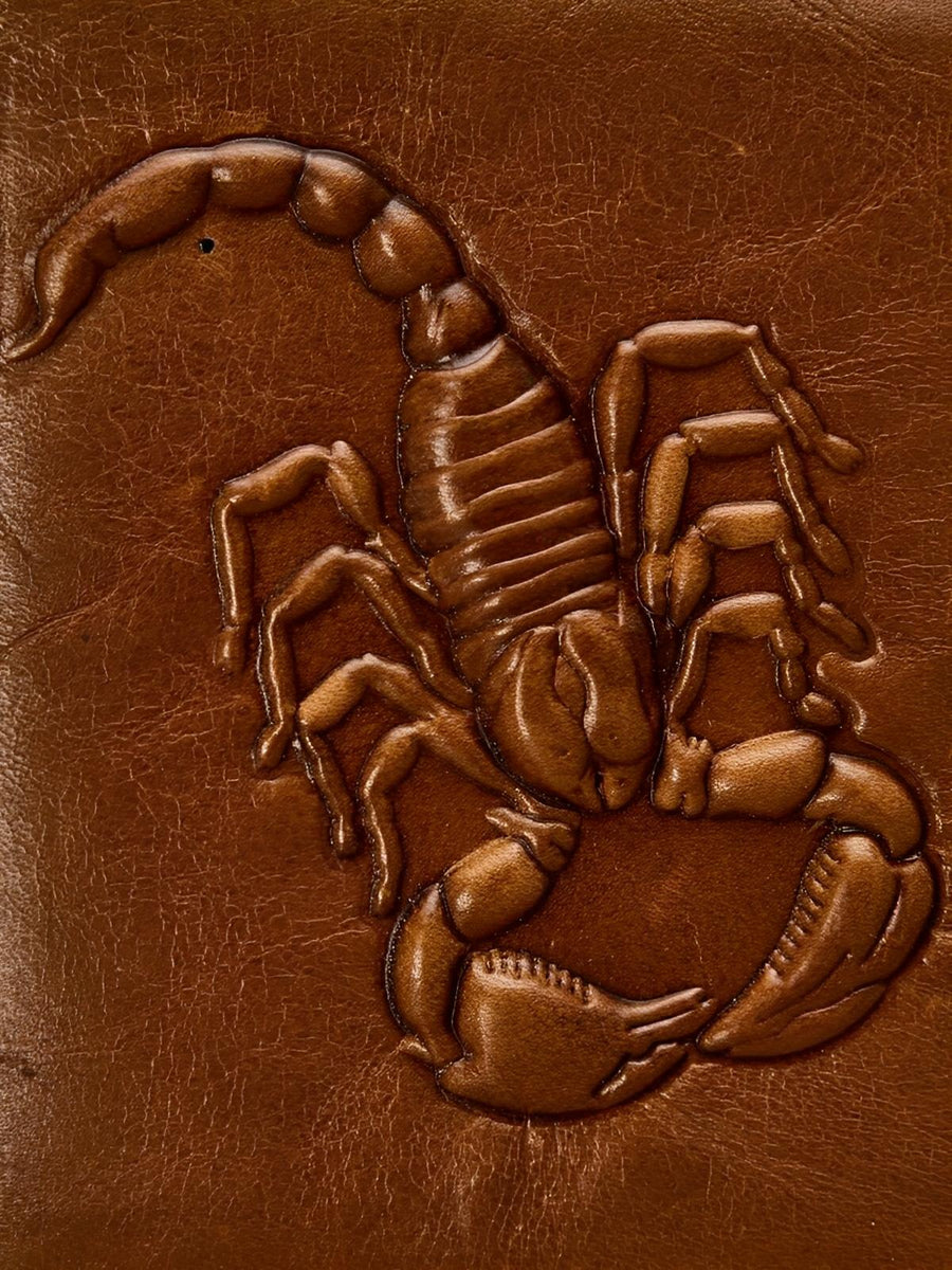 Portafoglio in pelle marrone, motivo scorpione in rilievo, compatto, scomparti multipli, modello Serkan