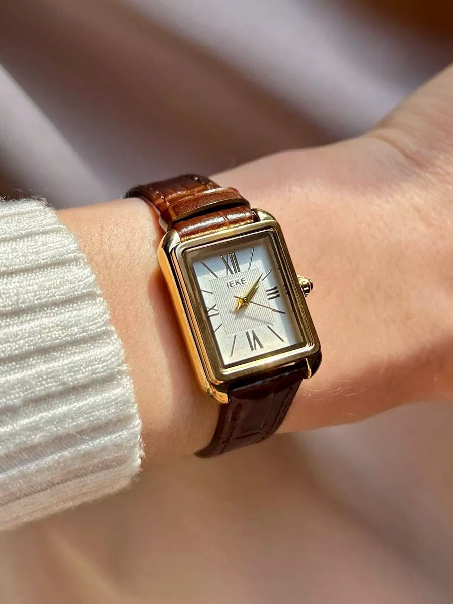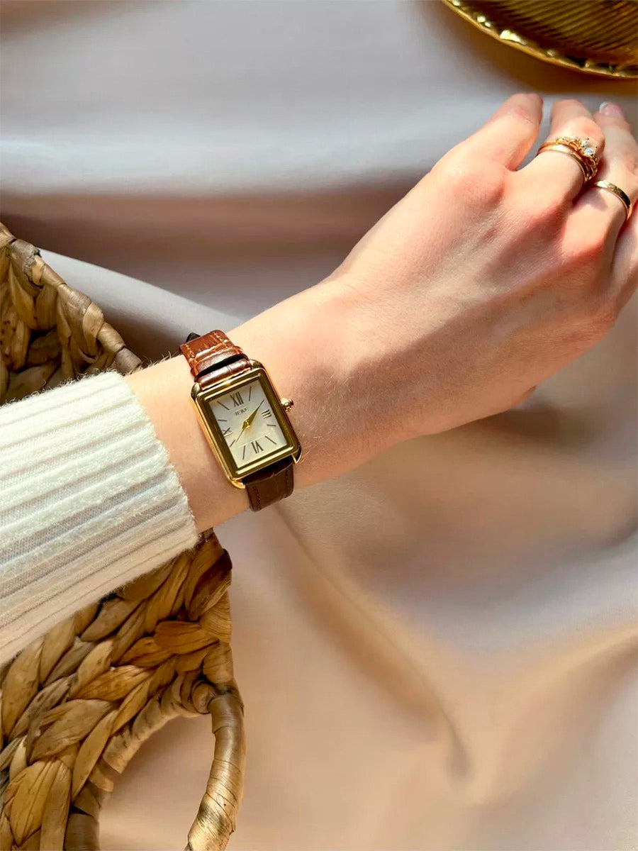 Ispirato ai codici classici del lusso discreto, questo orologio rettangolare da donna incarna un perfetto equilibrio tra raffinatezza e funzionalità. La sua cassa dorata dalle finiture arrotondate si adagia delicatamente sul polso, valorizzata da un cinturino sottile in similpelle testurizzata effetto coccodrillo, disponibile in nero o marrone.