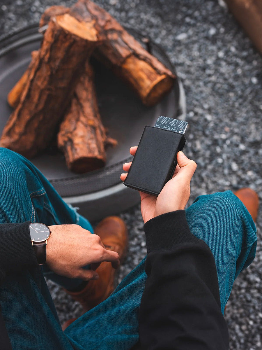 Questo portafoglio da uomo incarna la modernità funzionale in un formato compatto e raffinato. Grazie al suo meccanismo laterale scorrevole, accedete istantaneamente alle vostre carte essenziali con un solo gesto.