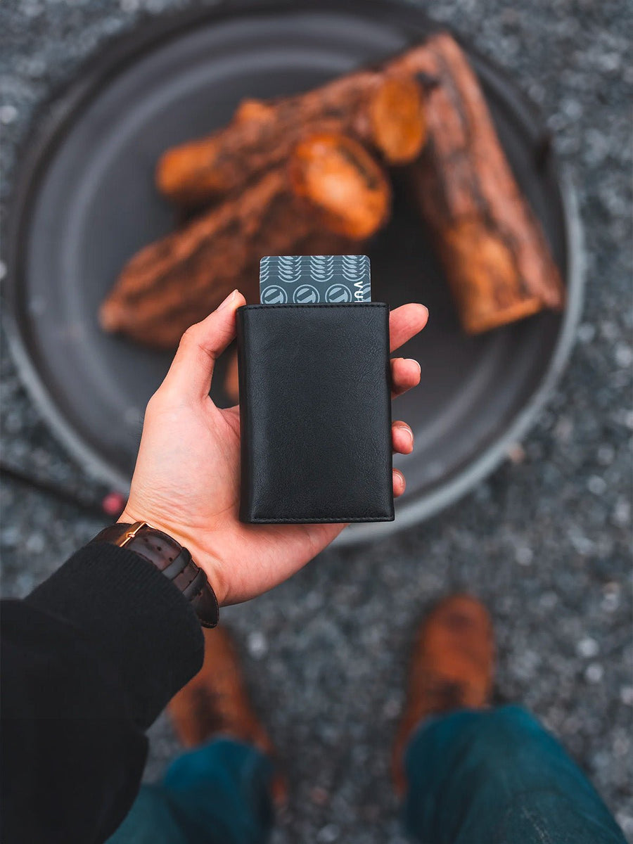 La struttura in alluminio leggero abbinata a un rivestimento in pelle nera liscia offre una protezione RFID ottimale contro il furto di dati, pur mantenendo un tocco morbido e un'eccellente presa in mano.