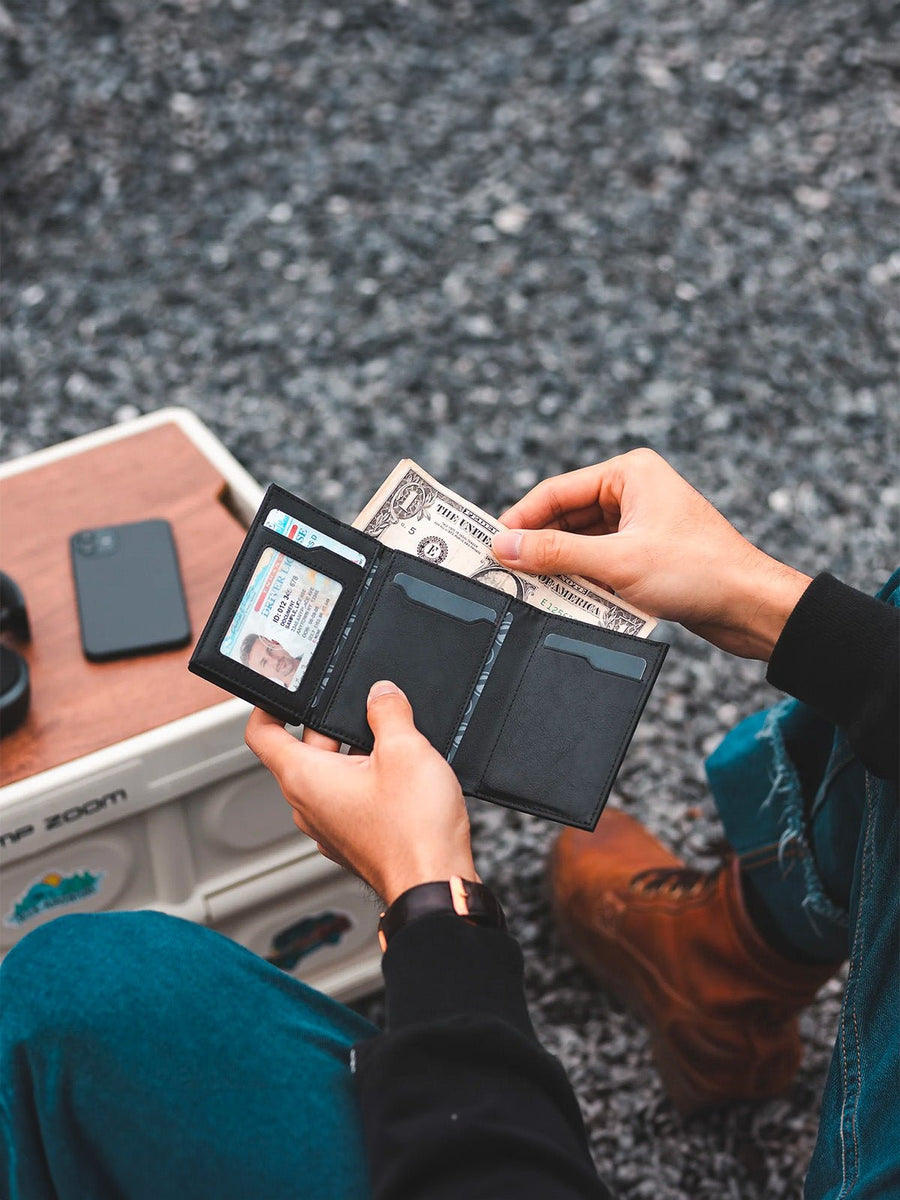 Il portafoglio integra una tasca con zip dedicata alle monete, un ampio scomparto per le banconote e una finestra trasparente per carta d'identità o patente. Dispone di diverse fessure interne per carte aggiuntive, garantendo un'organizzazione ordinata e accessibile.