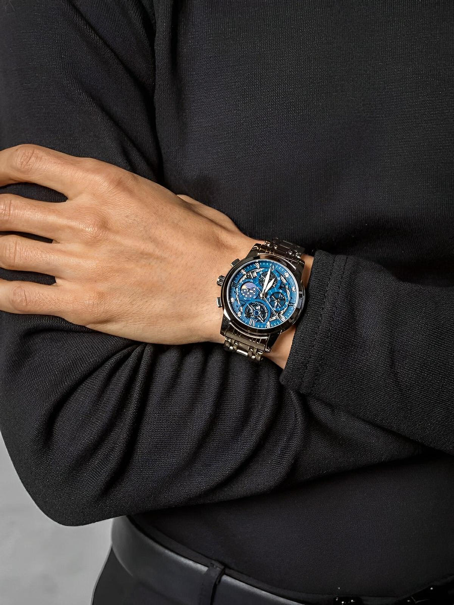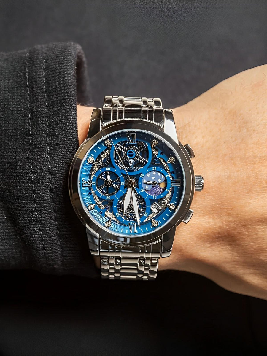 Orologio da uomo scheletrato, cronografo, acciaio inossidabile, quadrante blu, in acciaio inossidabile, modello Smith