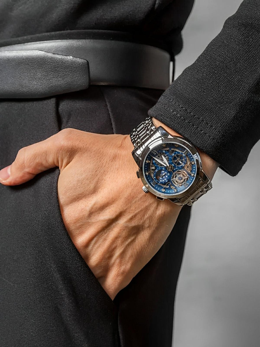 Immergetevi nell’universo della precisione e dello stile con questo orologio scheletrato da uomo. Il suo quadrante blu traforato rivela un design accattivante, arricchito da dettagli raffinati e da complicazioni funzionali. Il cronografo e la visualizzazione della data aggiungono un tocco di praticità alla vita quotidiana.