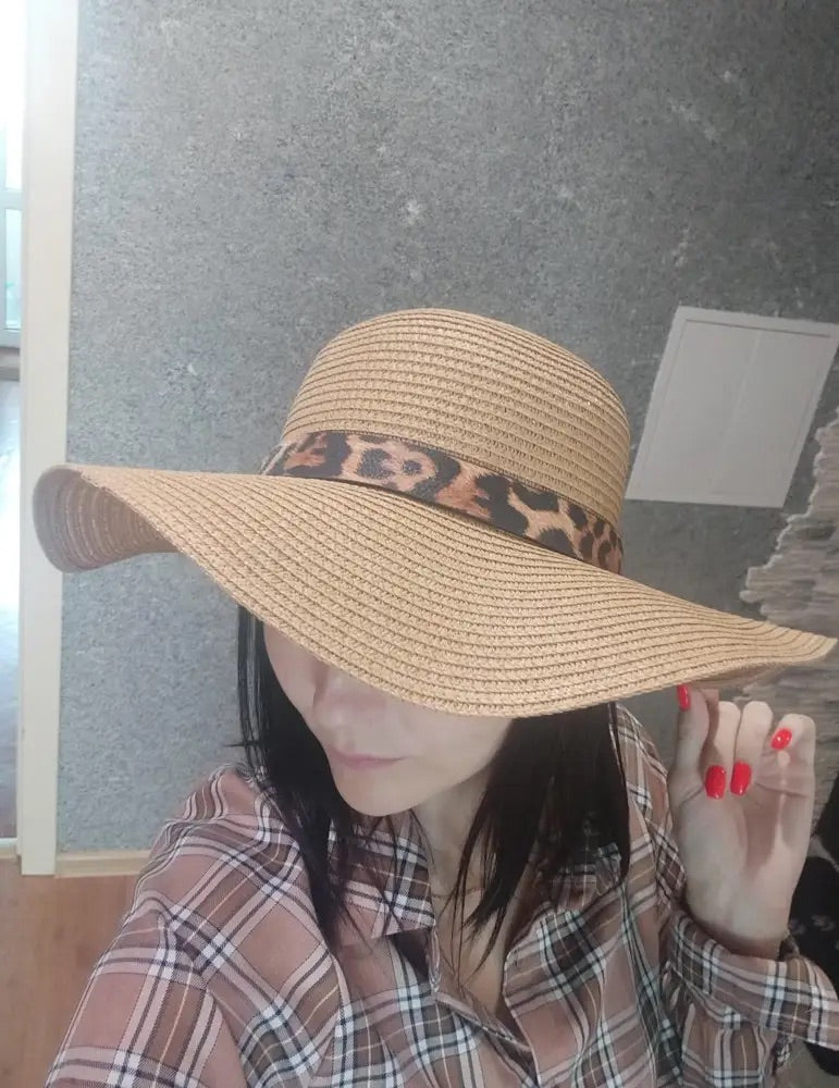 Cappello di paglia da donna, tesa larga, protezione solare, ideale per la spiaggia e l’estate, fascia con nastro leopardato, modello Solène