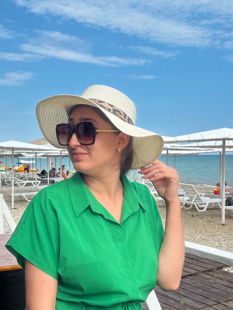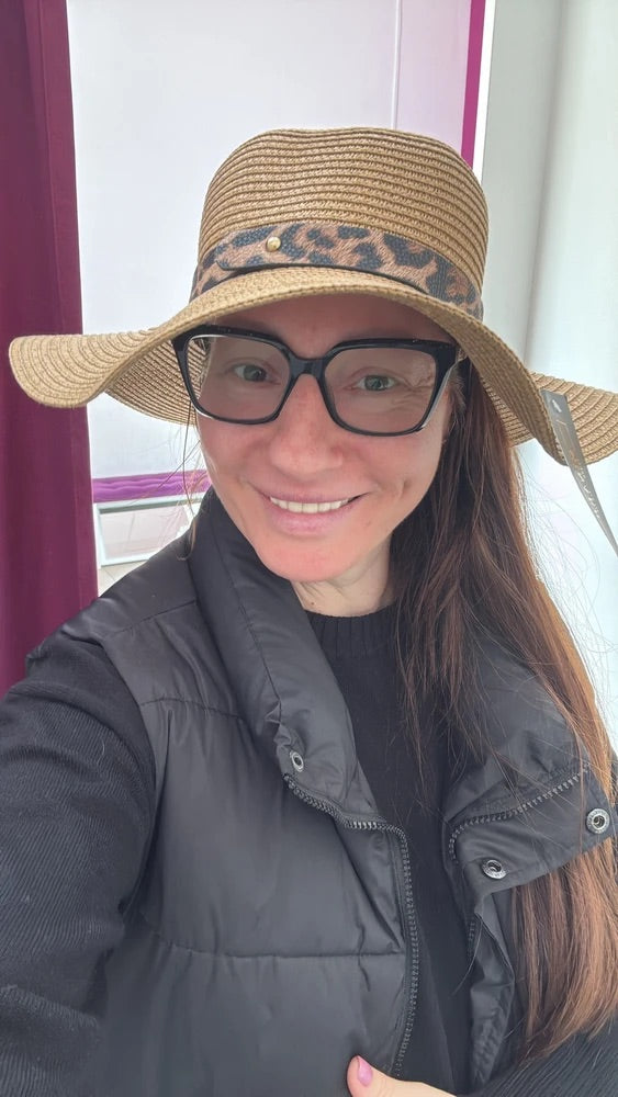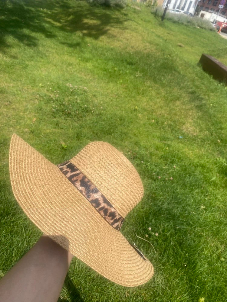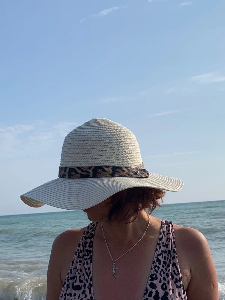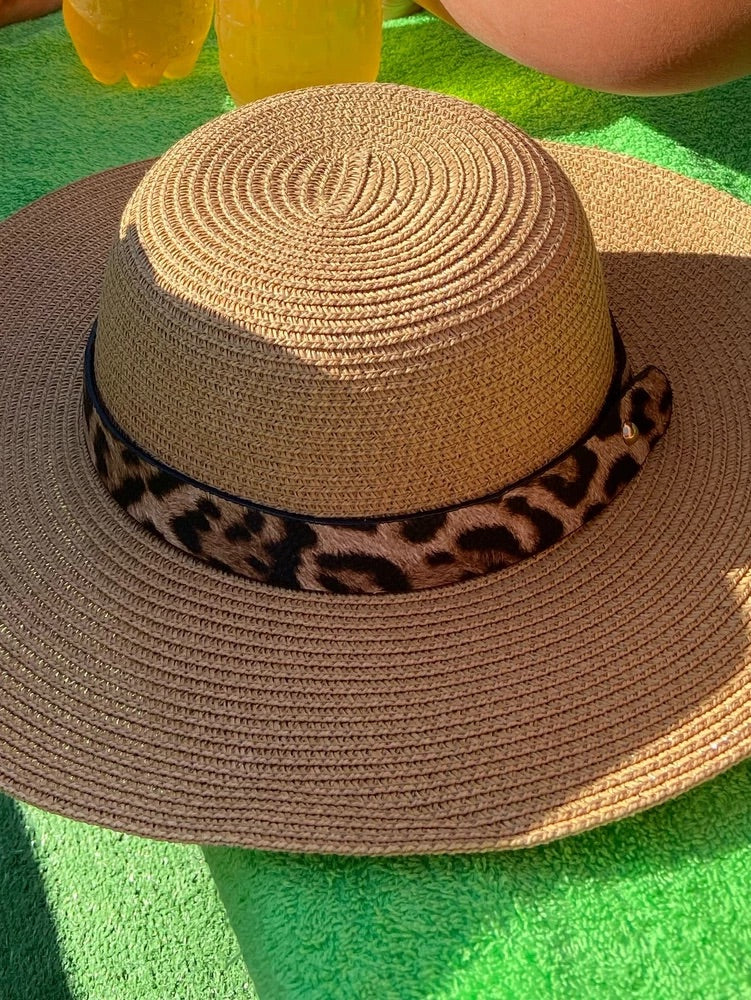 Il cappello è impreziosito da un nastro decorativo con motivo leopardato che aggiunge un tocco di fantasia e modernità. Questo dettaglio grafico lo rende un accessorio audace per valorizzare i vostri outfit estivi, sia che si tratti di un costume da bagno, di un abito leggero o di un completo casual.