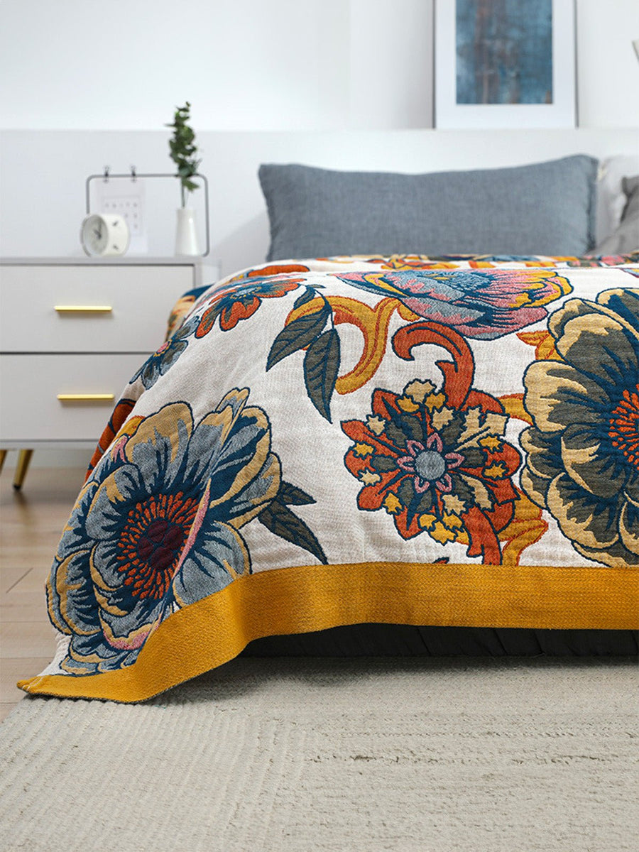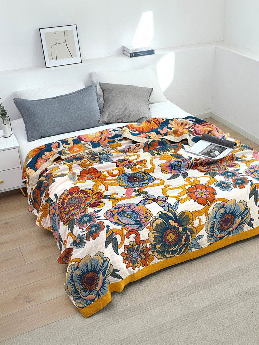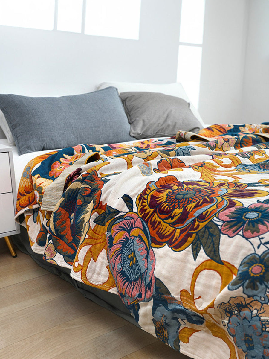 Plaid in cotone floreale, coperta traspirante, copriletto matrimoniale, motivo botanico colorato, tessuto morbido a 5 strati, mussola di cotone, modello Sorenz