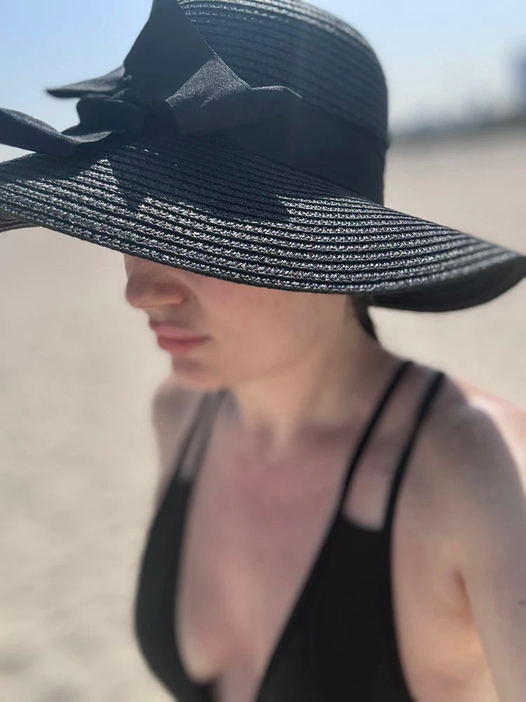 Cappello di paglia panama nero, da donna, tesa larga, protezione solare UPF40+, fiocco decorativo, estate spiaggia, modello Stella