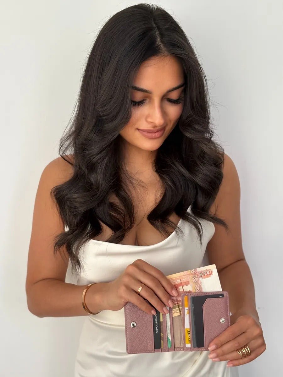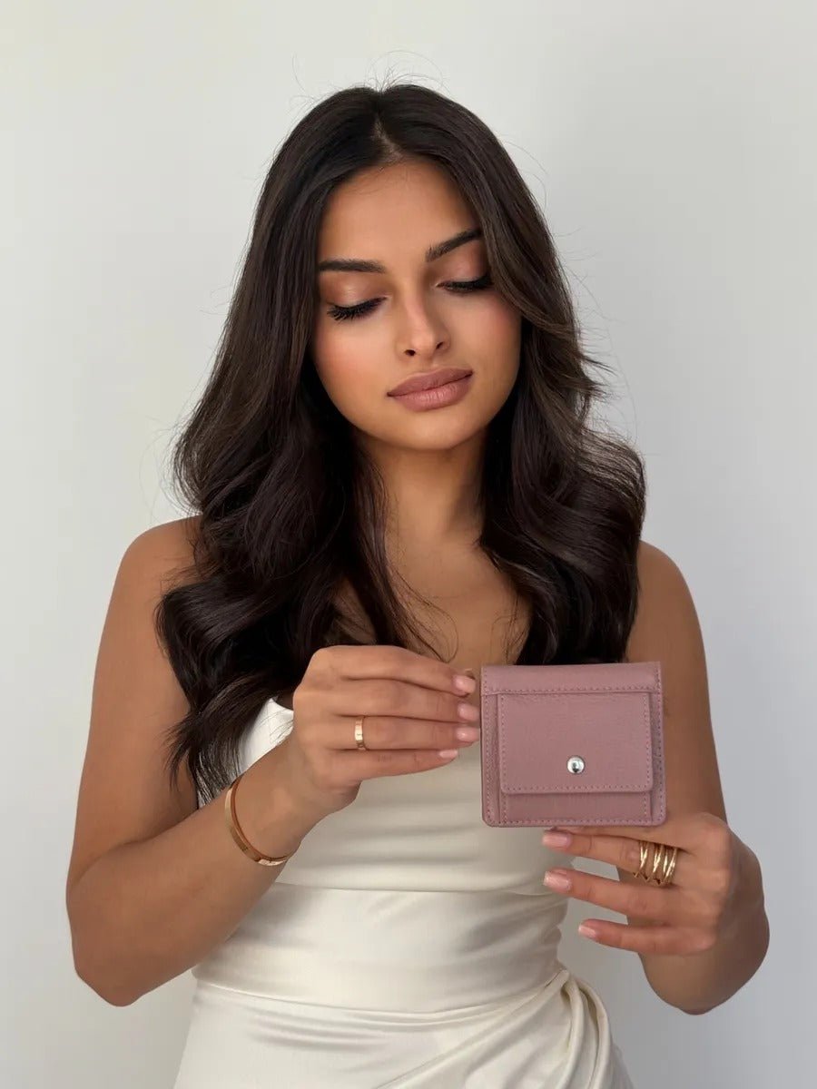 Questo portafoglio in vera pelle incarna la praticità in un formato minimalista. Progettato per le donne moderne, offre un’organizzazione intelligente in una dimensione ridotta. Il suo design pieghevole si apre per rivelare sei scomparti per carte, un comparto per le banconote e una tasca esterna per le monete con chiusura a bottone a pressione.