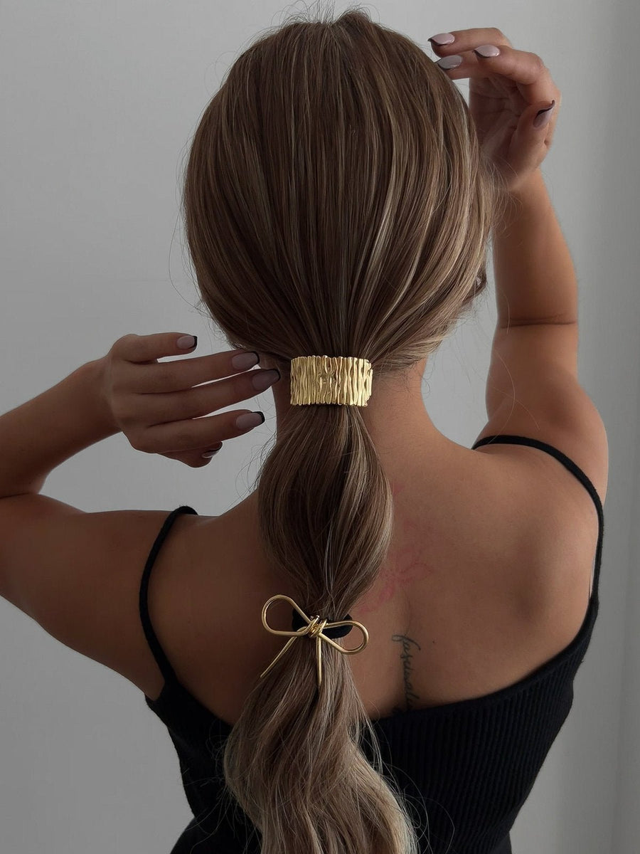 Disponibile in finitura dorata o argentata, questo scrunchie è ideale per chi ama i dettagli discreti ma decisi. La sua ottima elasticità permette di mantenere i capelli in ordine senza rovinarli, mentre il design minimalista si adatta sia a un look professionale che a un’occasione più elegante.