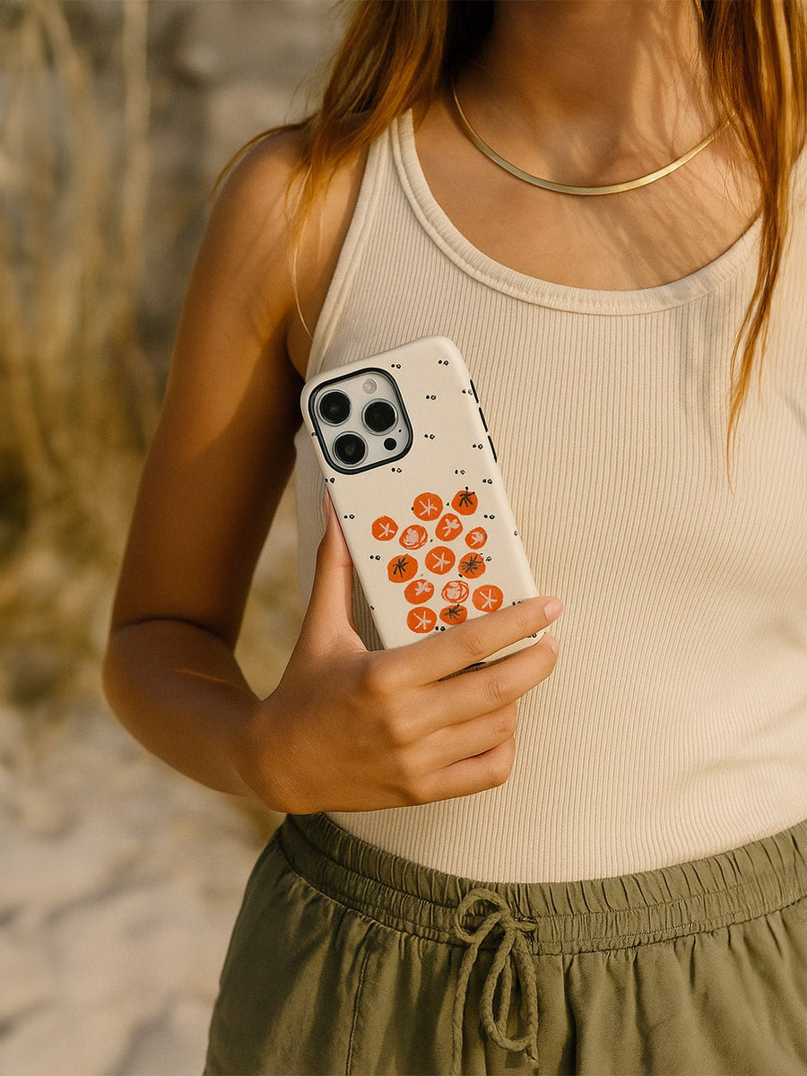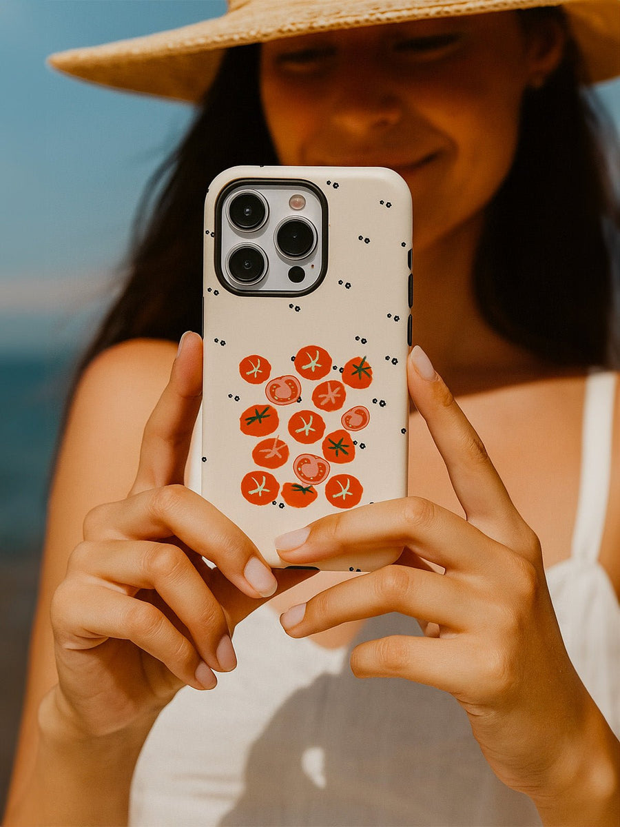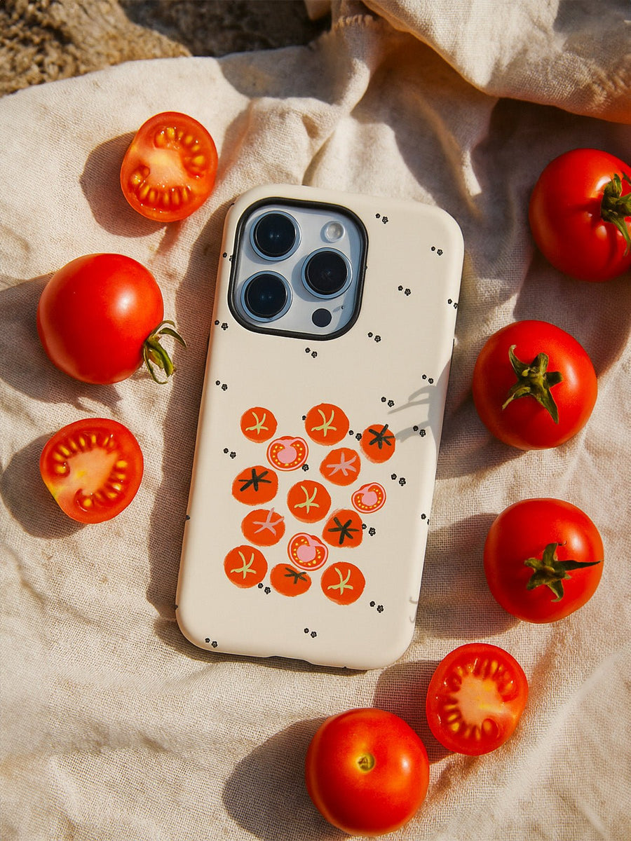Questa custodia dal motivo pomodori reinterpreta lo stile spensierato e giocoso con un tocco grafico unico. Realizzata in materiale rigido opaco, offre una presa sicura e piacevole.