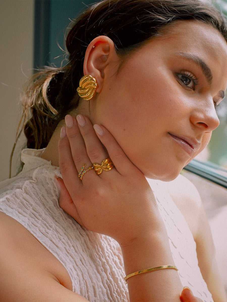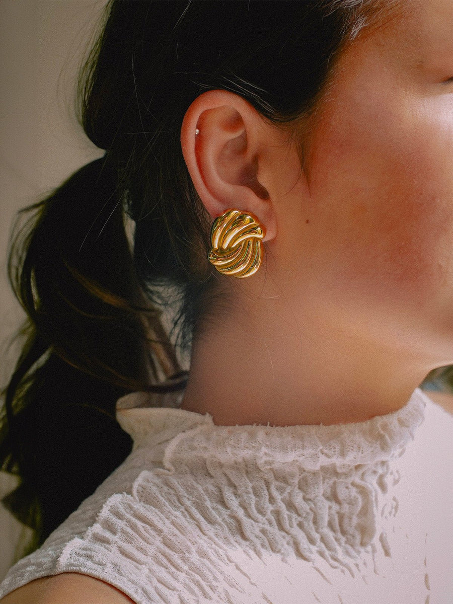 Affermate la vostra personalità con questi orecchini scultorei dal design geometrico audace. Ispirati alle linee rétro dei gioielli degli anni '80, aggiungono istantaneamente un tocco deciso a qualsiasi outfit. Il loro volume lavorato e la brillantezza dorata creano un equilibrio perfetto tra minimalismo e impatto visivo.