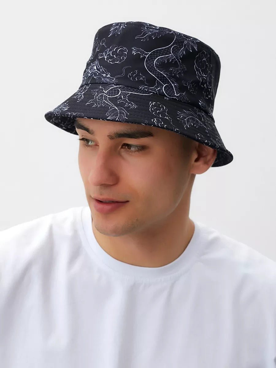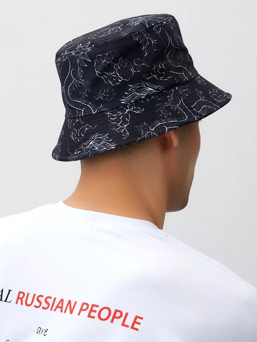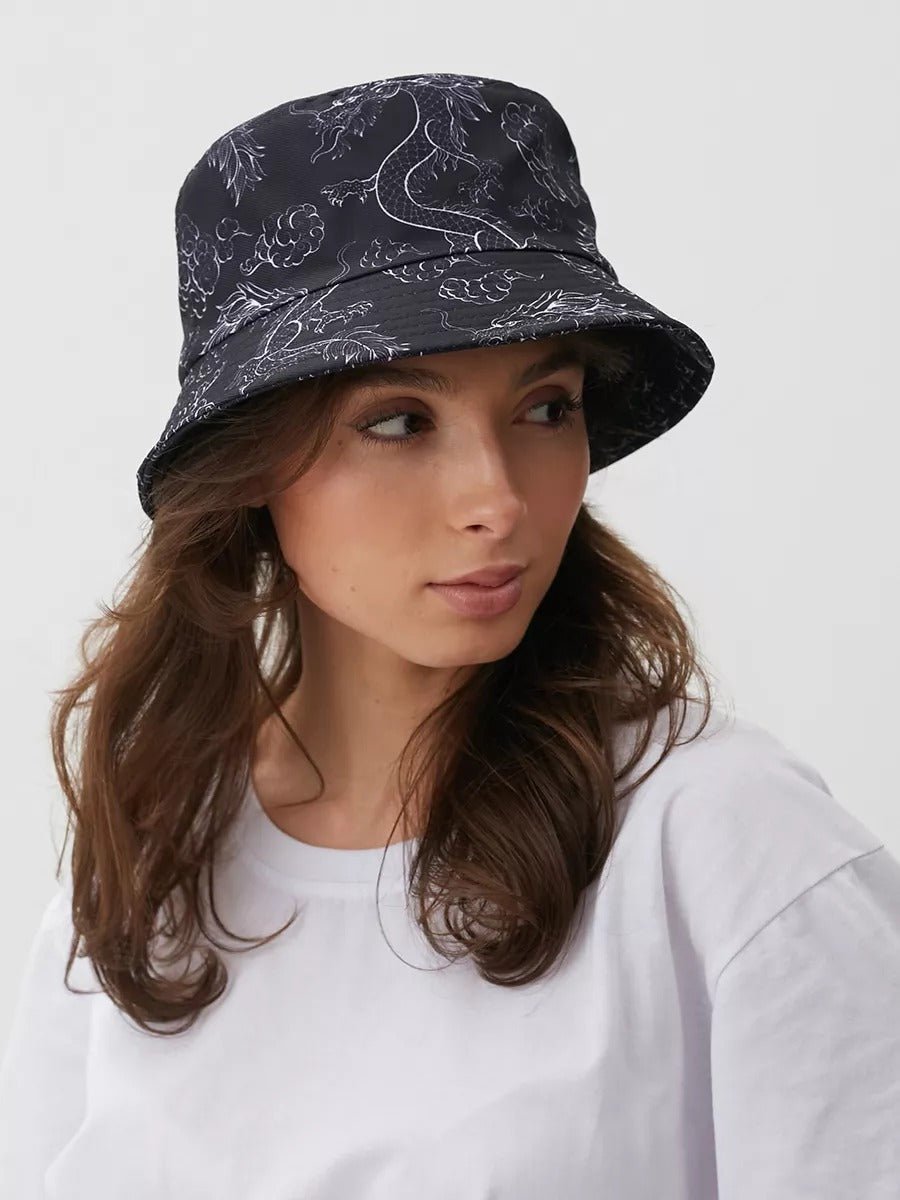 Aggiungete un tocco di carattere ai vostri outfit con questo bucket hat dal motivo mitico. Il suo design nero essenziale arricchito da draghi bianchi lo rende versatile e distintivo, perfetto per gli amanti della moda urbana e degli accessori originali.