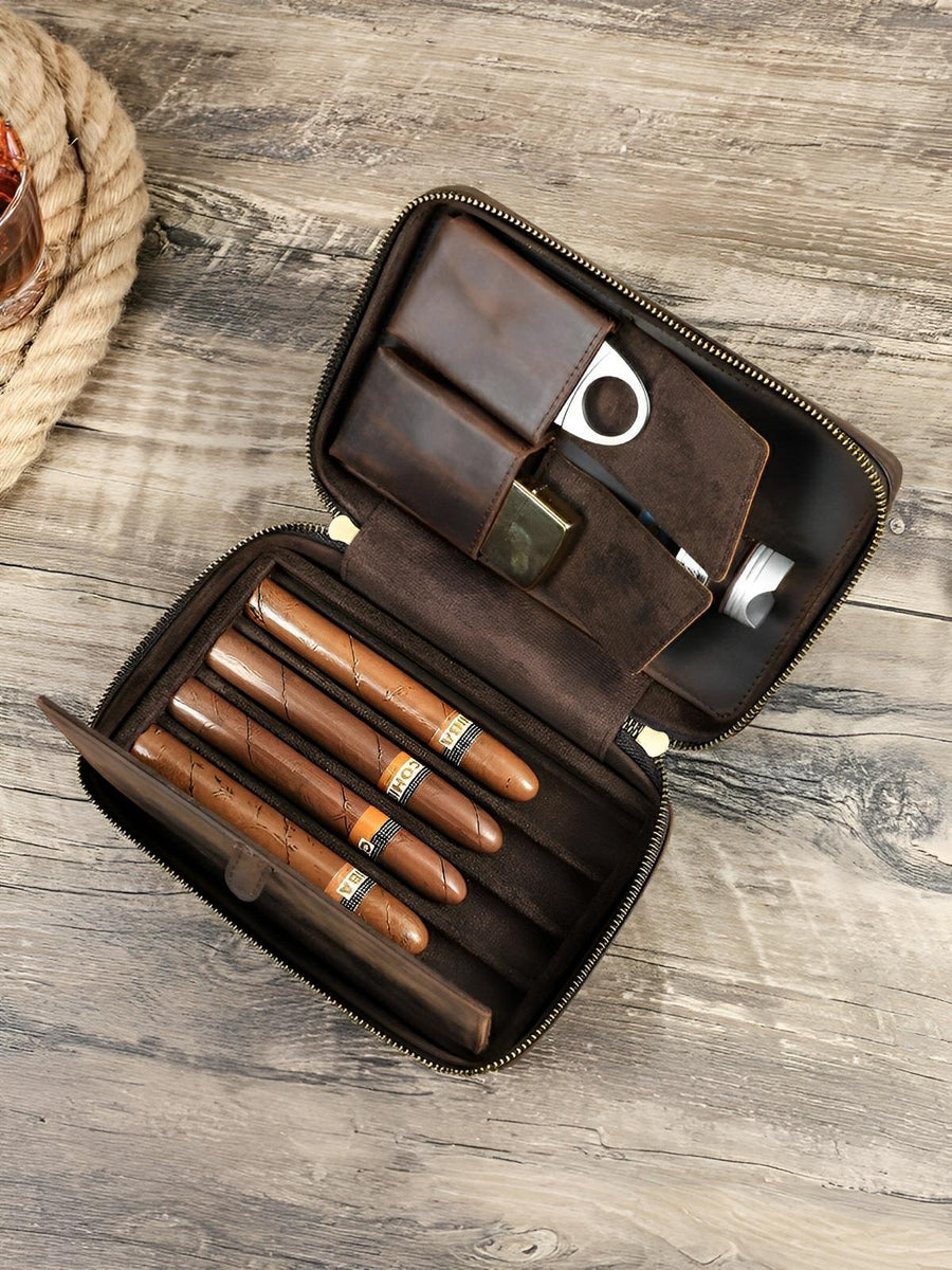 Dotato di tasche dedicate per i vostri accessori (tagliasigari, accendino…), garantisce un’organizzazione ordinata e sicura. La sua cerniera robusta assicura una perfetta ermeticità, mentre il laccetto in pelle facilita il trasporto.