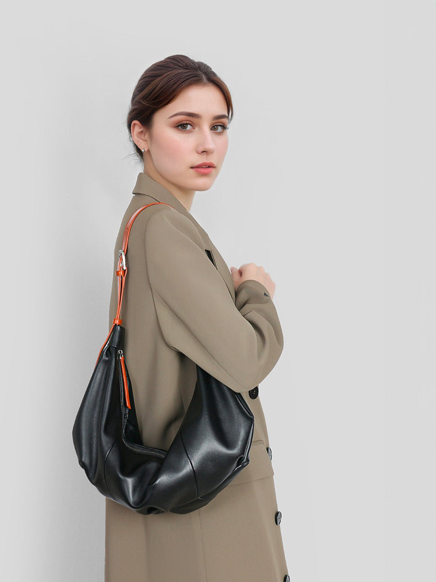 Questa borsa hobo dal design strutturato reinterpreta la forma dumpling in una versione moderna e funzionale. Realizzata in pelle di vitello morbida di alta qualità, si distingue per la sua caduta naturale e le sue curve generose.