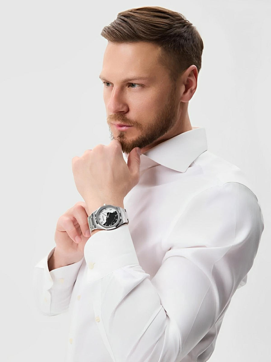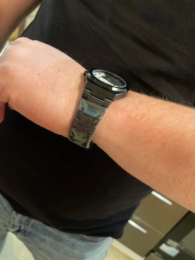 Il bracciale in acciaio inossidabile si adatta perfettamente al polso, offrendo un comfort ottimale per tutta la giornata. Grazie alla chiusura a farfalla con doppio pulsante, garantisce una tenuta sicura e pratica.