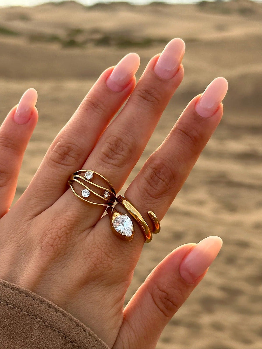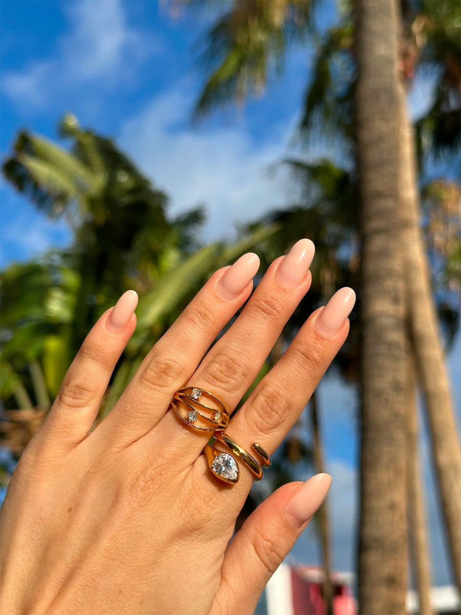Ispirato dalle linee serpentine, questo anello dorato cattura la luce con eleganza grazie alla sua finitura brillante e alla sua forma avvolgente intorno al dito. Il suo design minimalista è valorizzato da una pietra bianca scintillante a forma di goccia, che dona luminosità a ogni movimento.