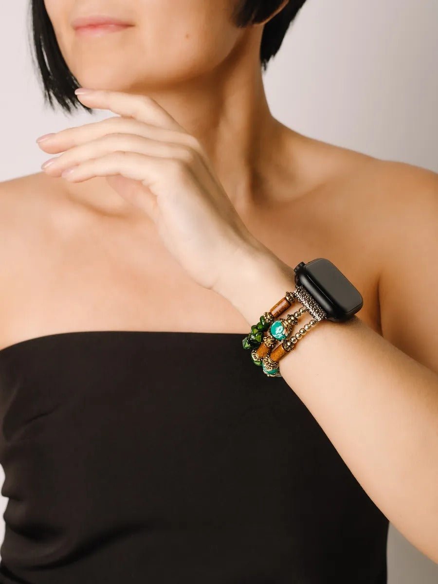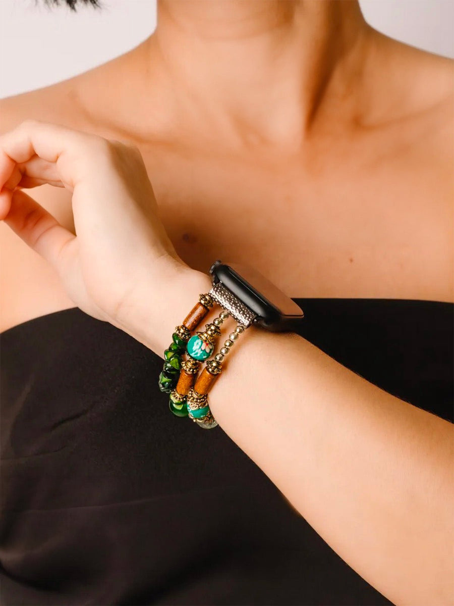 Aggiungete un tocco di carattere unico al vostro orologio con questo cinturino compatibile Apple Watch. Realizzato con una combinazione armoniosa di perle dorate, legno naturale e pietre verdi, trasforma il vostro smartwatch in un vero e proprio gioiello. Le sue tre file di perle offrono uno stile bohémien raffinato che cattura lo sguardo e valorizza il vostro polso.