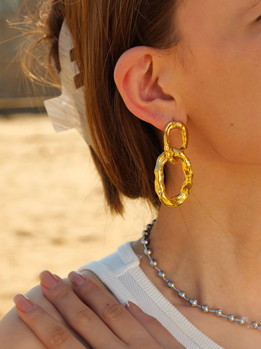 Questi orecchini geometrici giocano sulla struttura irregolare e sulla luce. Ogni pezzo è composto da due maglie texturizzate, unite in un design scultoreo dalla finitura brillante. La placcatura in oro 18K esalta i rilievi garantendo al tempo stesso una splendida durata nel tempo.