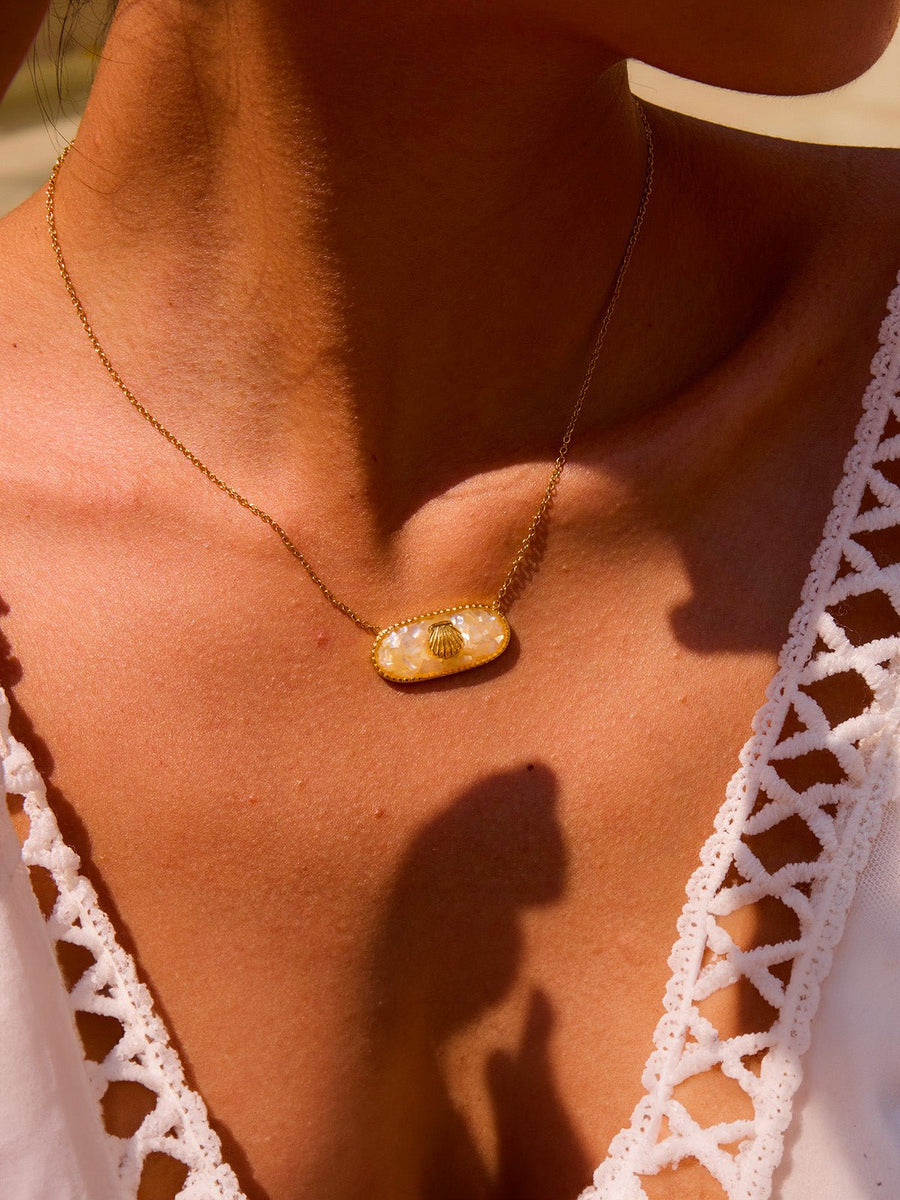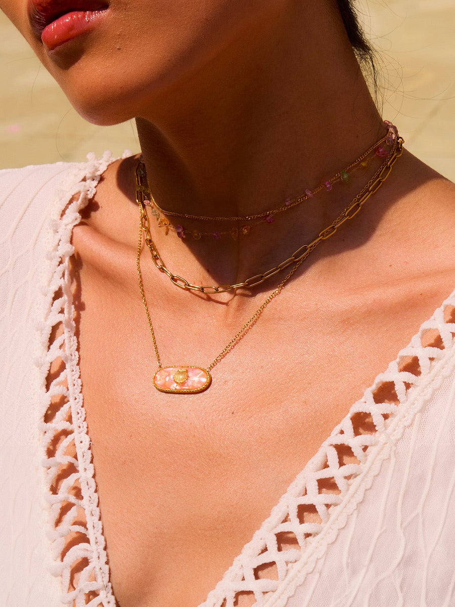Questa collana incarna la freschezza estiva attraverso il suo pendente ovale incastonato di madreperla, impreziosito da un delicato guscetto dorato. È disponibile in tre tonalità solari – rosa corallo, giallo madreperlato e blu laguna – che richiamano i colori dei frutti esotici e delle acque limpide.
