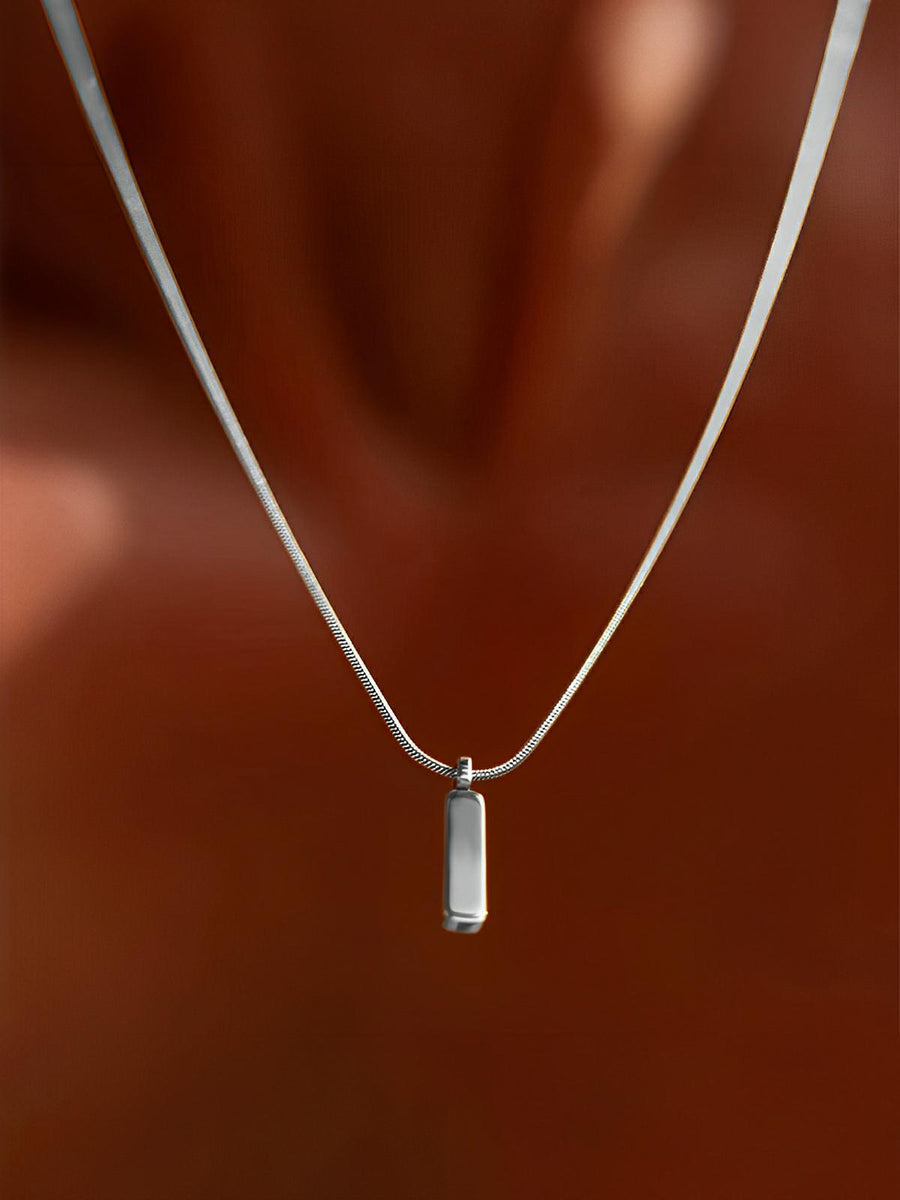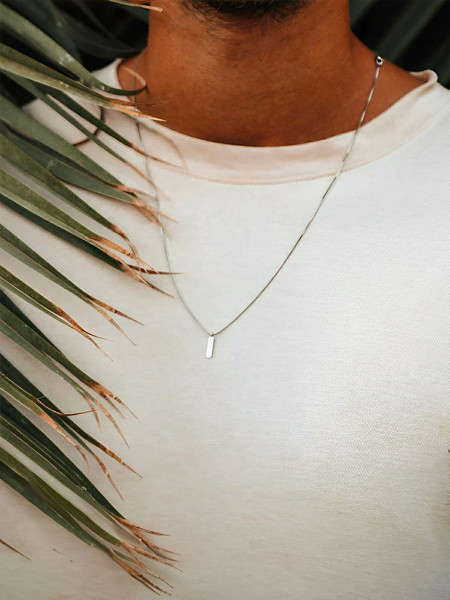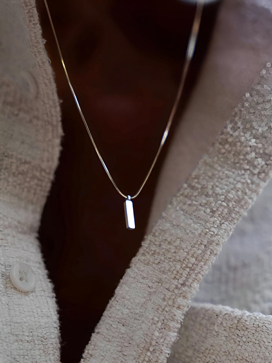 Questo collare maschile in acciaio inox unisce minimalismo e presenza con un pendente geometrico essenziale montato su una catena a serpente flessibile. Il suo design rettangolare lucidato riflette una luce soffusa, aggiungendo un tocco contemporaneo a ogni outfit.