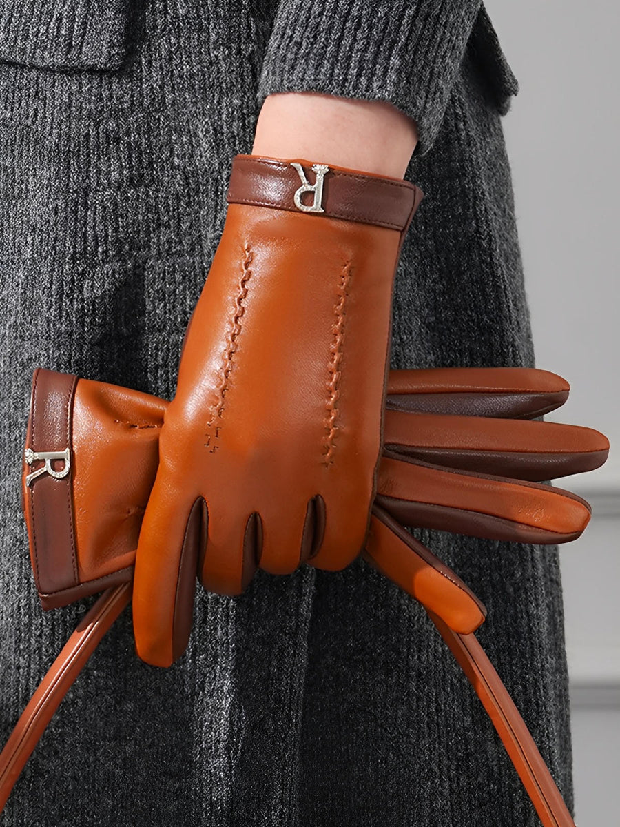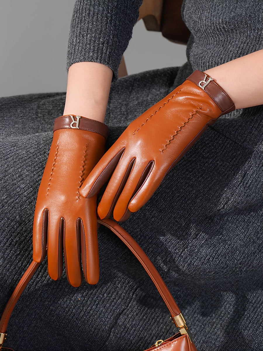 Guanti in pelle marrone da donna, foderati in pile, compatibili con schermo tattile, eleganti per l’inverno, accessorio moda, modello Winea
