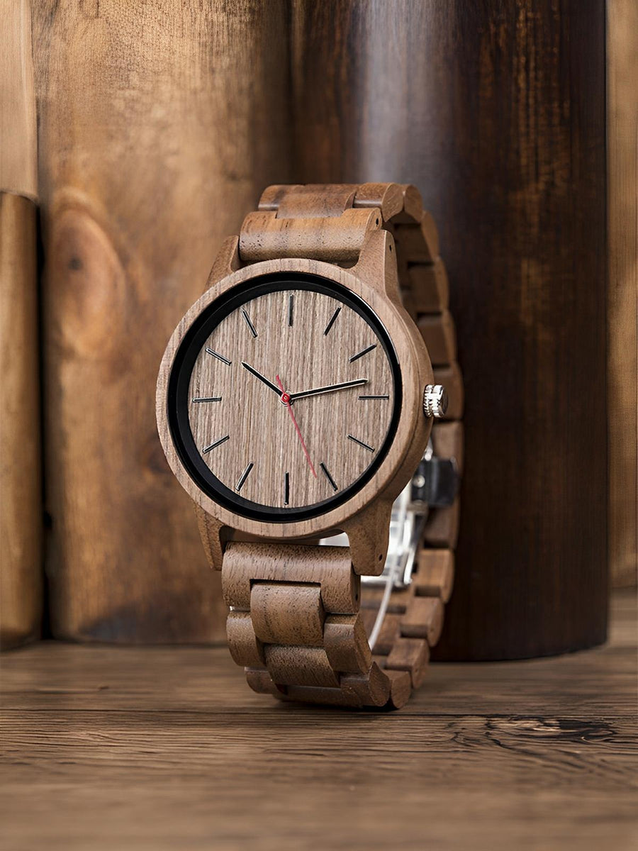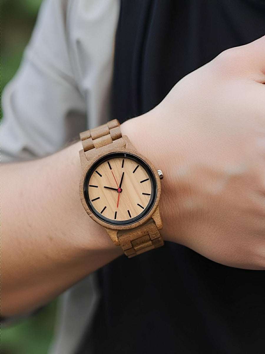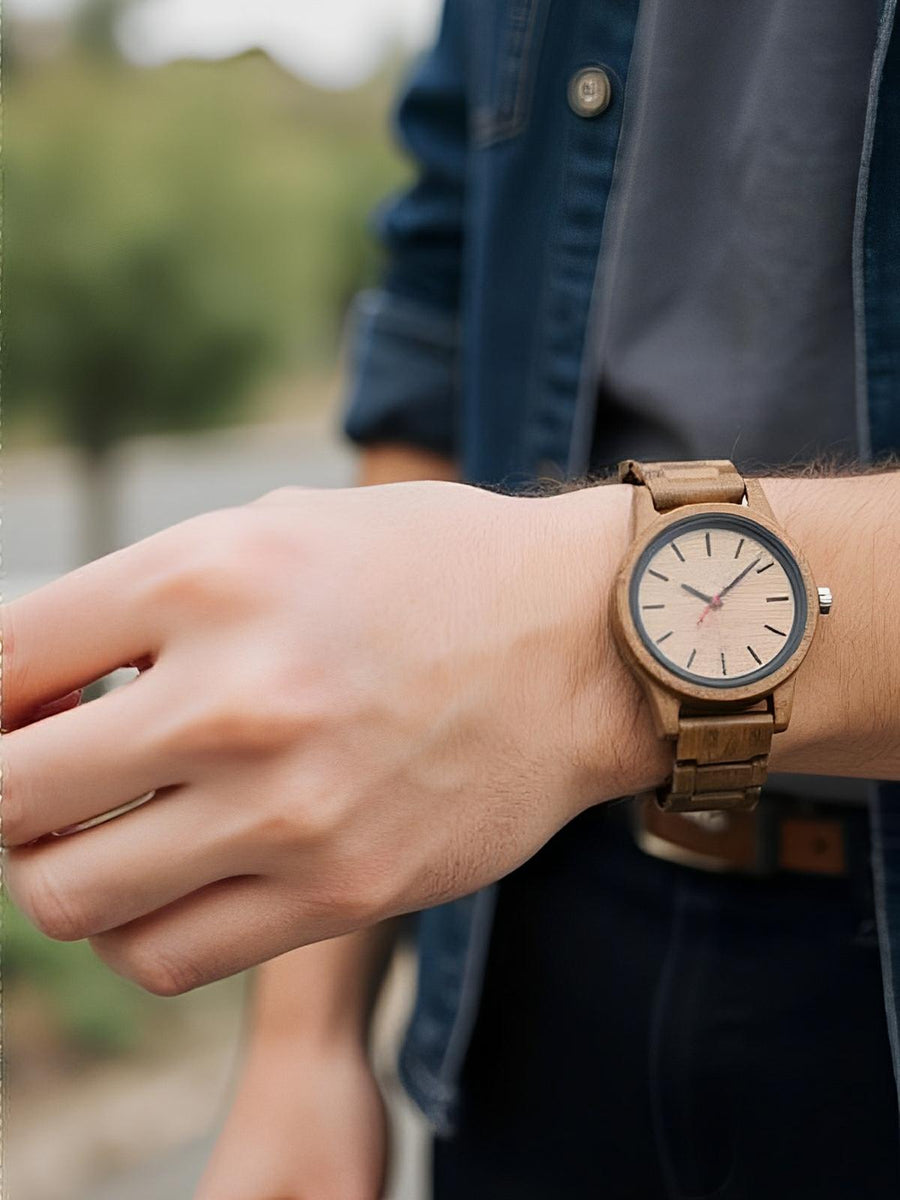 Scoprite un orologio in legno che unisce semplicità e autenticità. Il suo quadrante in legno naturale presenta un design essenziale con eleganti indici a bastone, offrendo una lettura chiara dell’ora. Leggero e piacevole da indossare, questo orologio è perfetto per uno stile quotidiano al tempo stesso chic e informale.