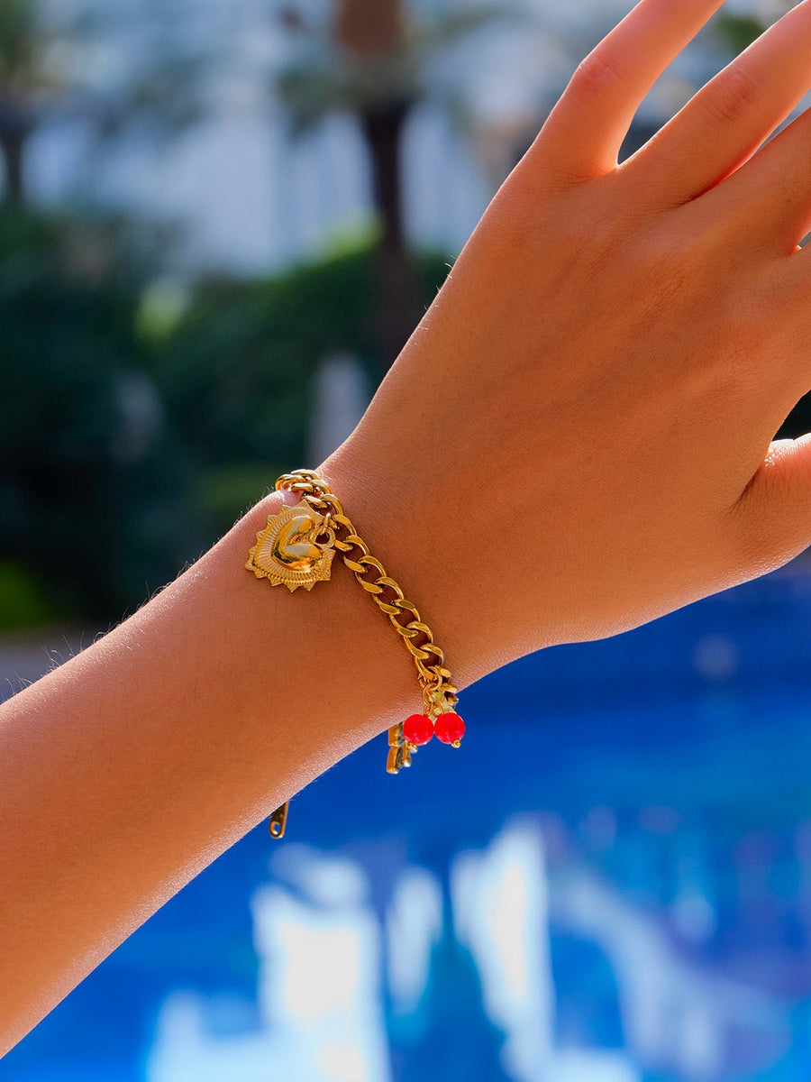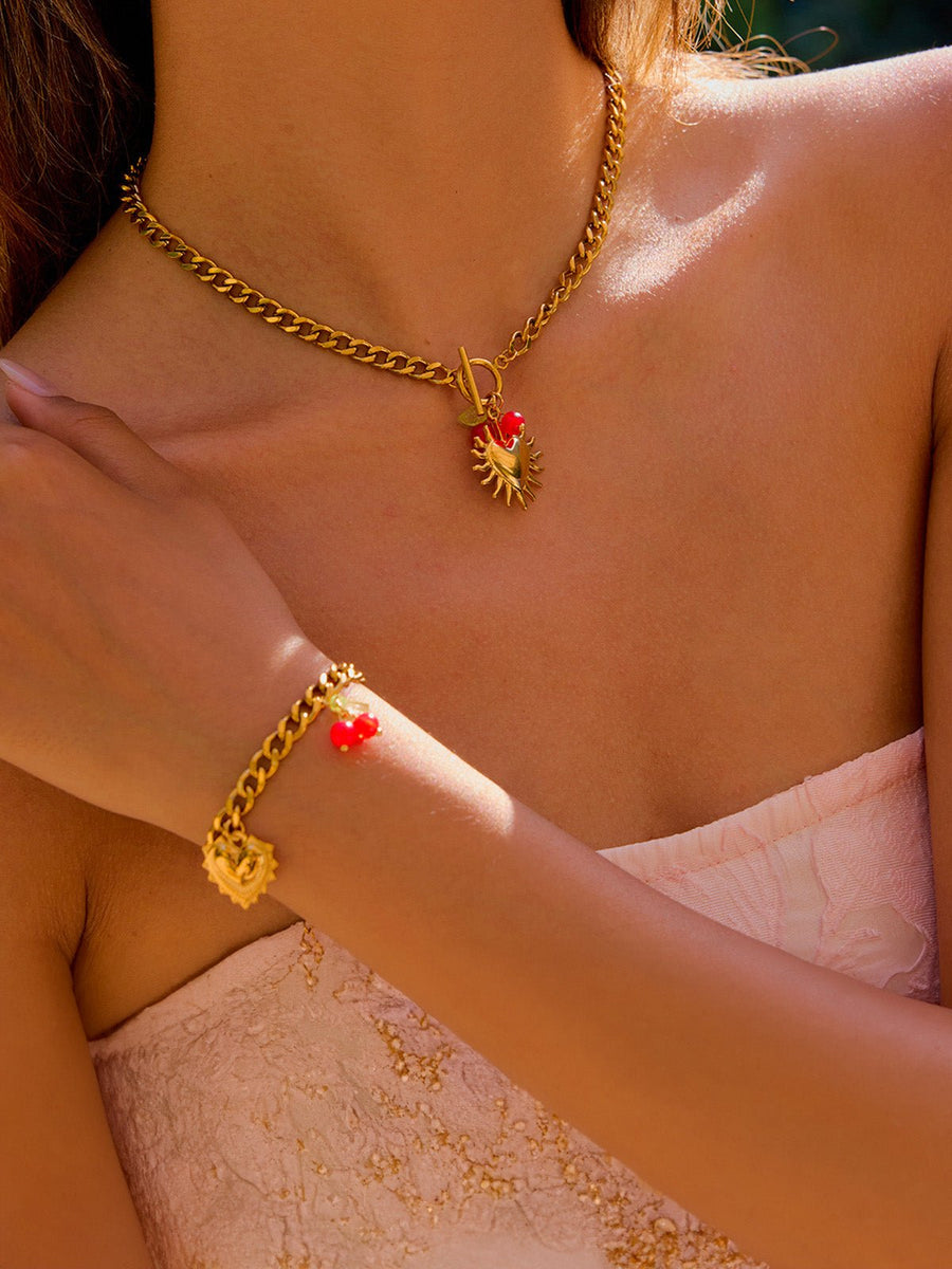 Sublimatez il vostro polso con questo bracciale gourmette dorato impreziosito da delicati charms: un cuore lavorato, un fiocco raffinato e un piccolo grappolo di ciliegie rosso vivo.